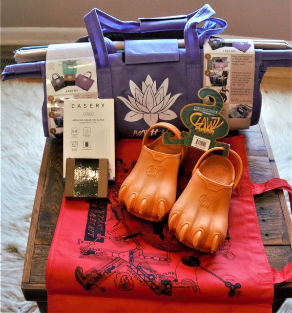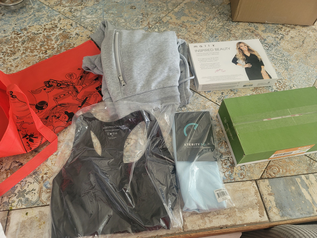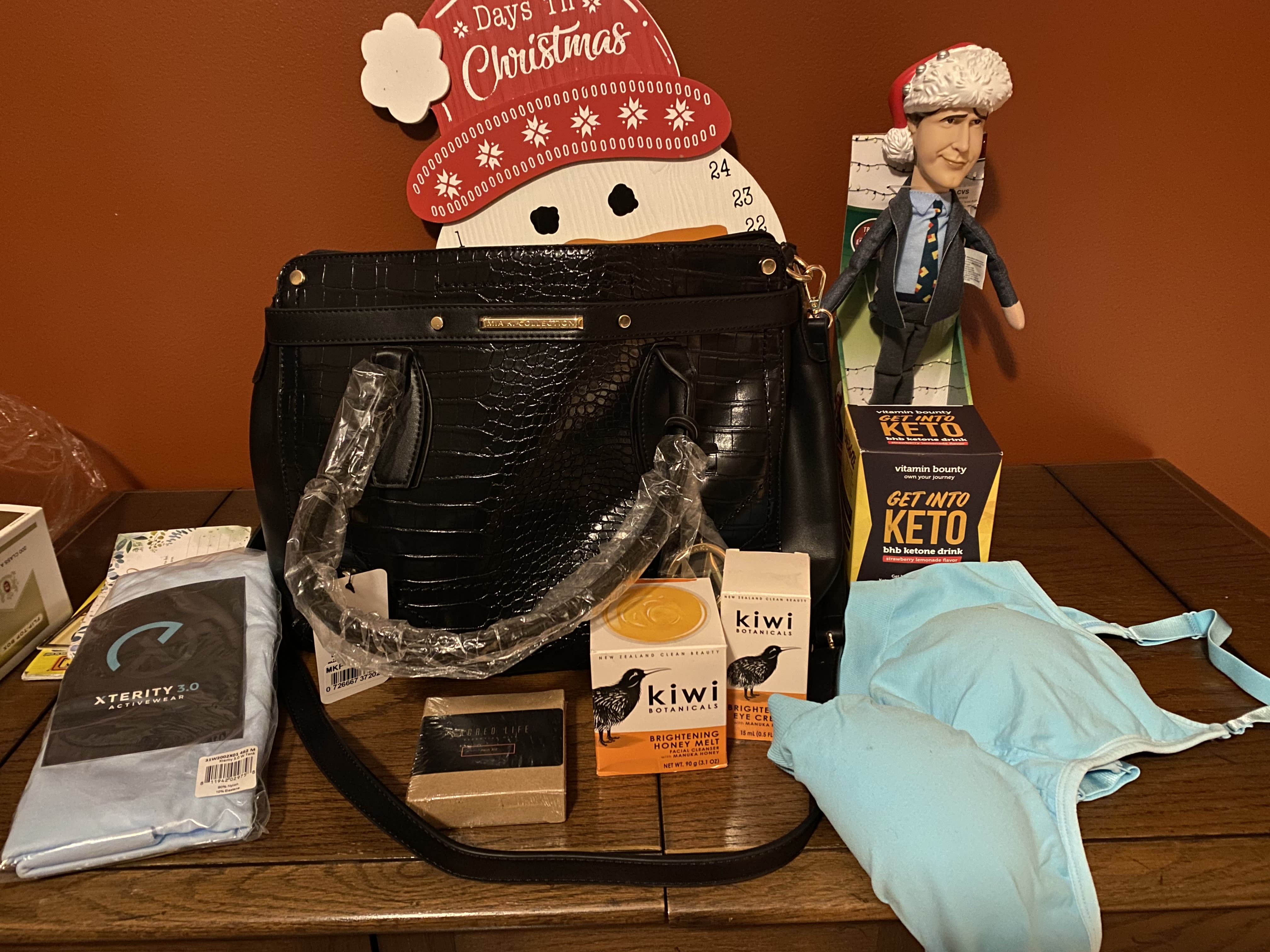 I got a mattress topper, (wrong size for any of the beds we have) a package of “cute pens”, a pair of sweatpants size M and a navy blue IRK bag. Meh.