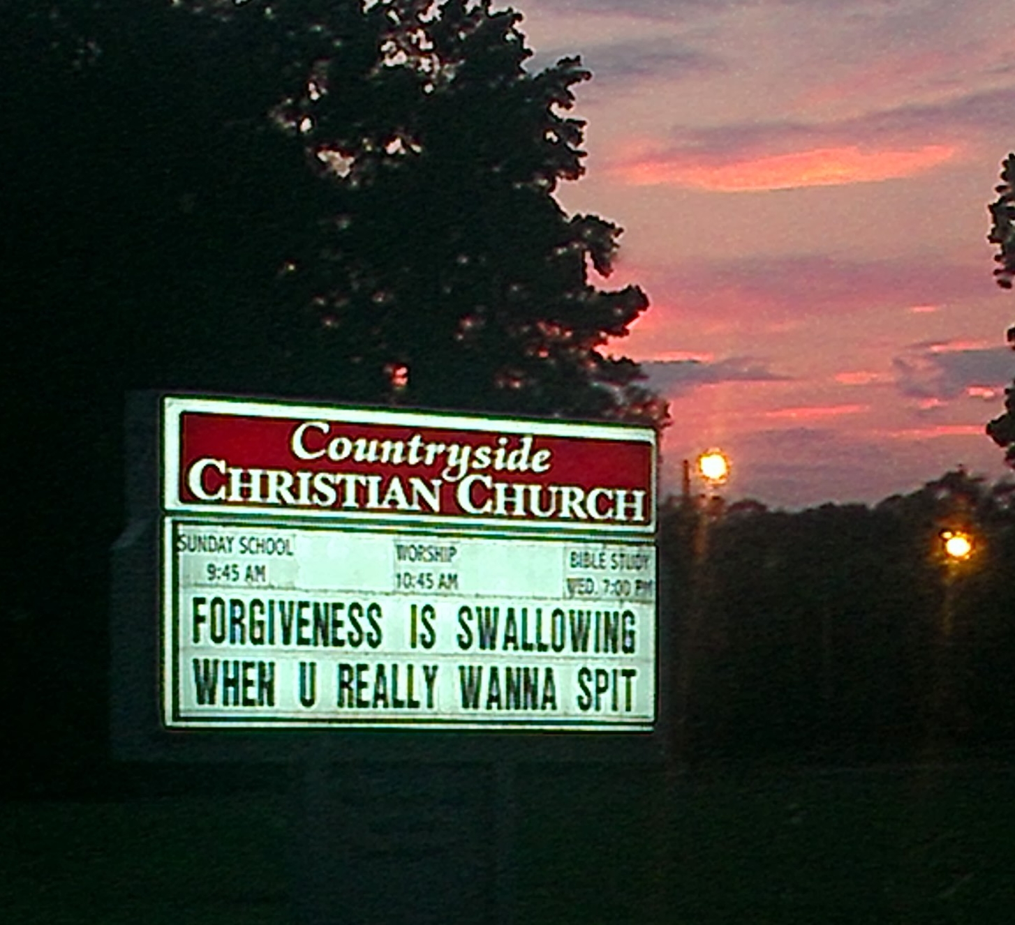 I couldn’t get a picture of it, but years ago, on a very busy street in my city, as you were driving southbound, there was a sign for a well known, “by the hour” motel that would appear(hills+forced perspective) right next to a church sign that read, “What part of ‘no’ don’t you understand?” It wasn’t an intentional sign war I don’t think, just a divine coincidence.