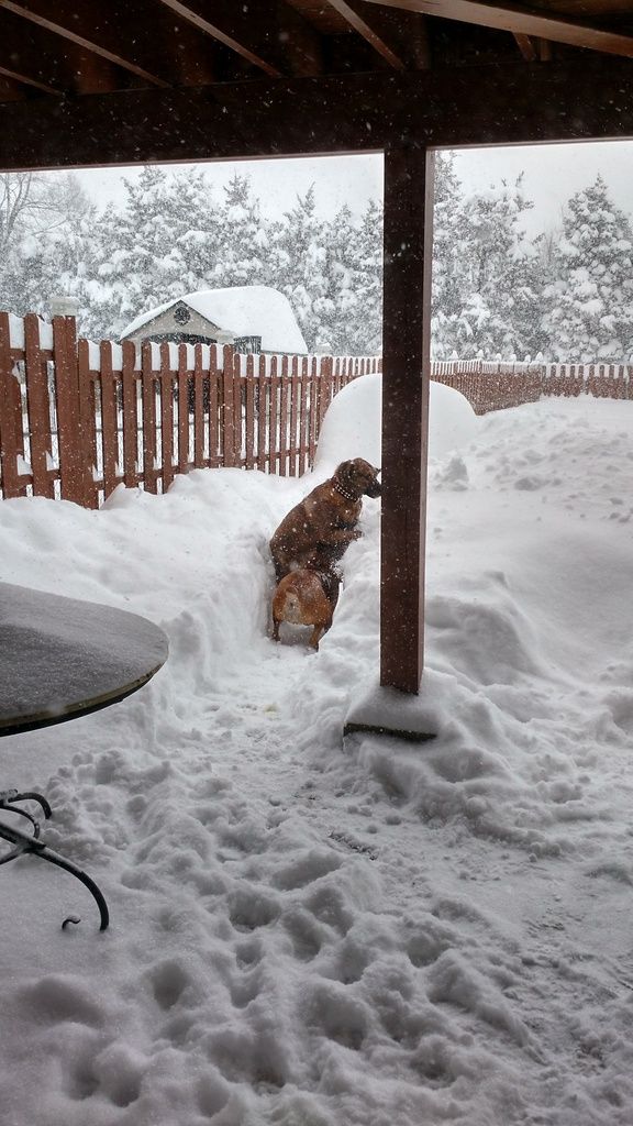 @dashcloud Roxy does okay. She's not really all that small; she's a boxer, she just looks small there because Galen is really tall and she's crouched down a bit. Anyway, she mostly keeps to the paths that were shoveled or the kids made in the snow while walking around.