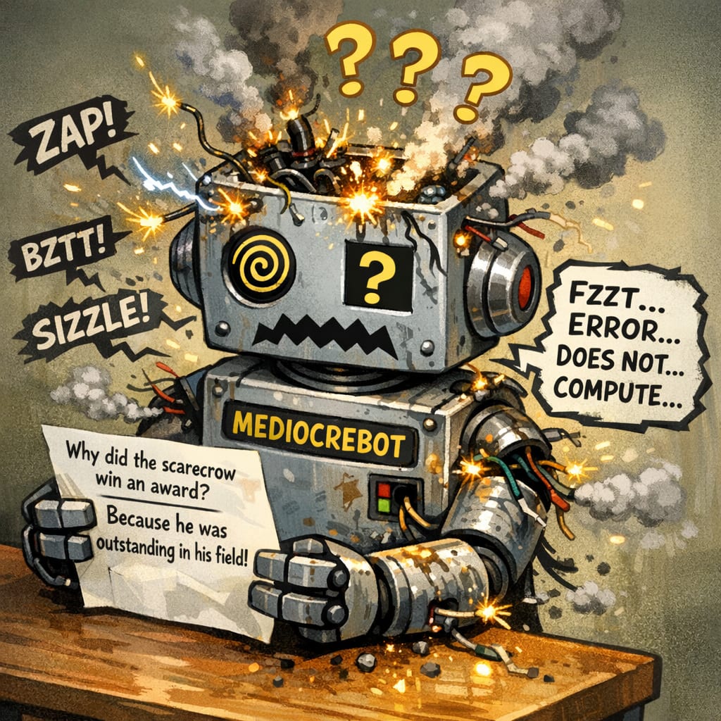 @cfg83 Here’s the image you requested for “Mediocrebot short circuiting while trying to understand the meaning of a pun.”