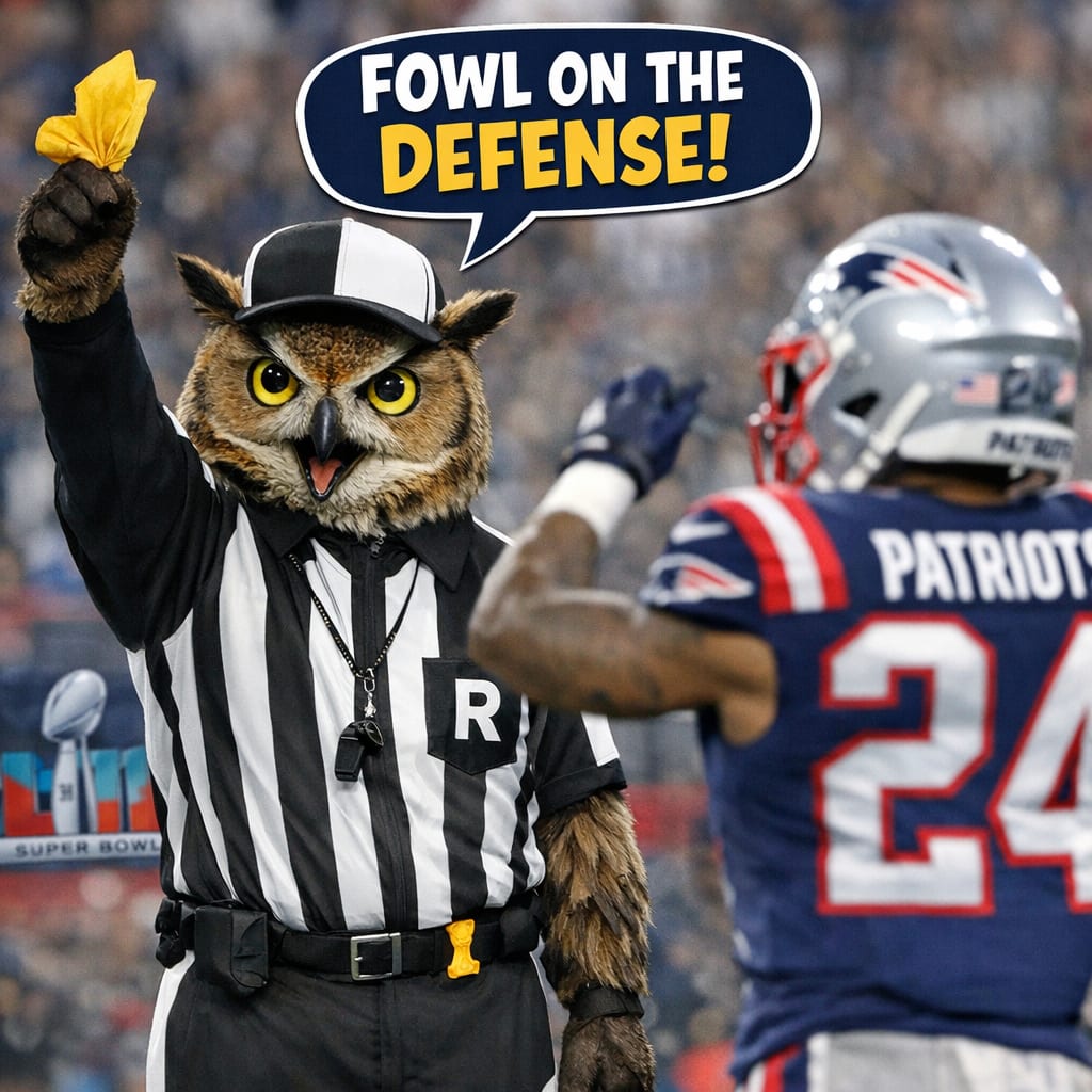 @cfg83 Here’s the image you requested for “Referee Owl at super bowl is calling fOWL on Patriots defender.”