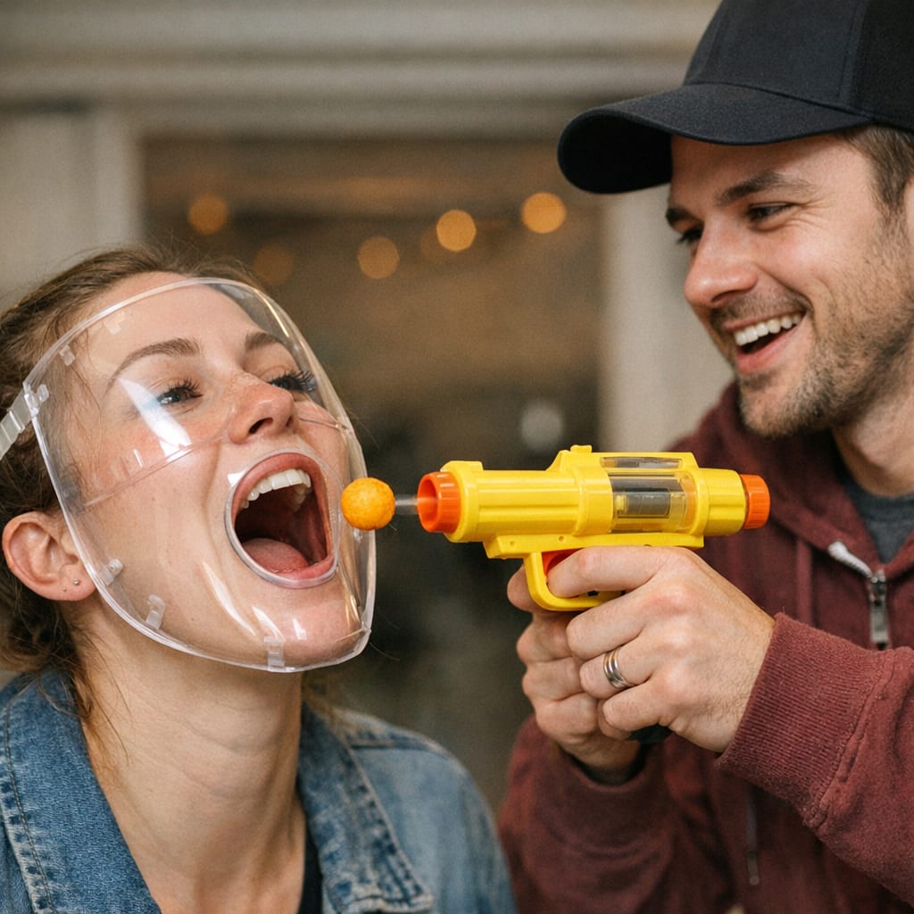 /showme First person with clear face mask except an open circle at the mouth. Second person is shooting cheese ball from yellow plastic toy gun into mouth of first person.