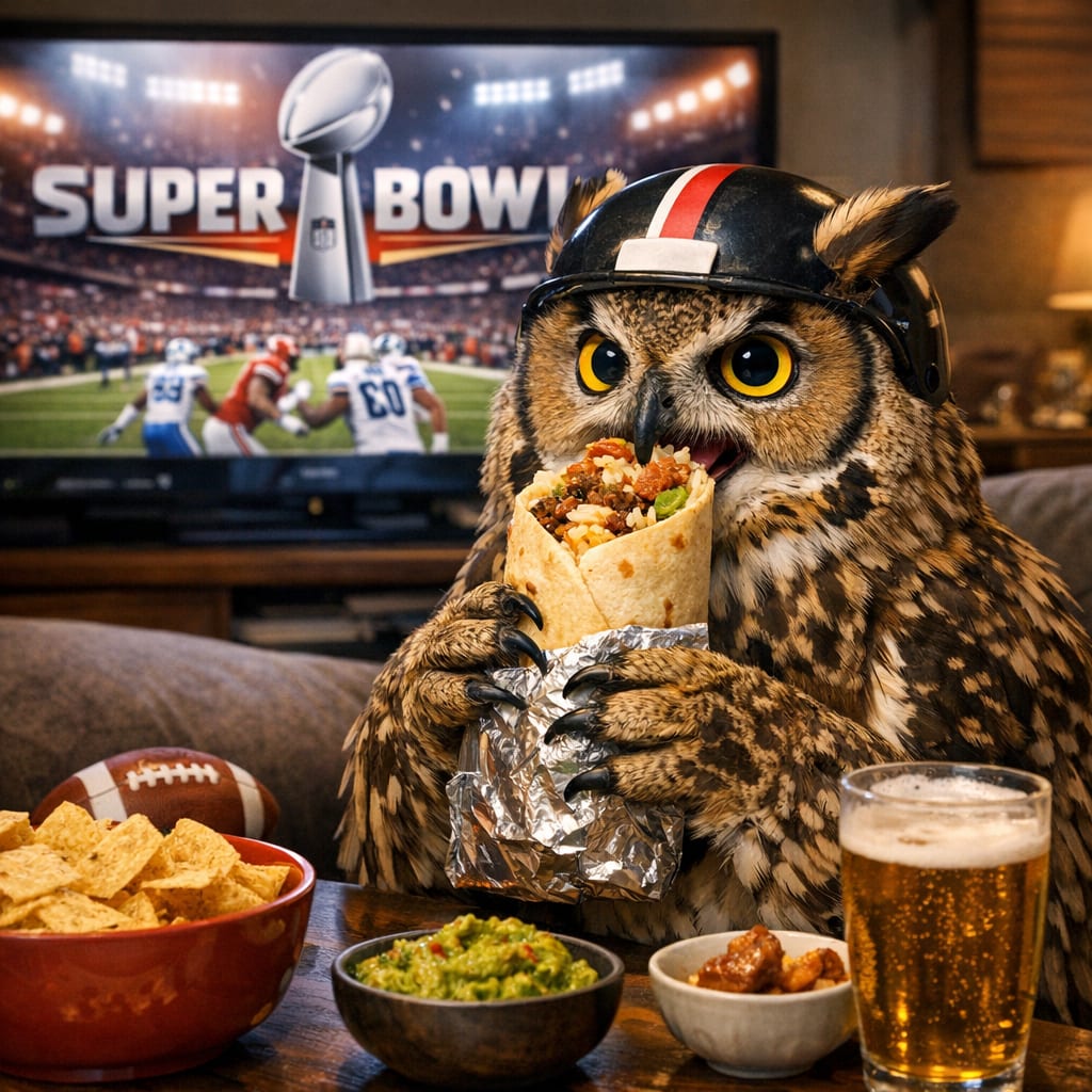 @cfg83 Here’s the image you requested for “a superb owl eating a burrito and watching the super bowl.”