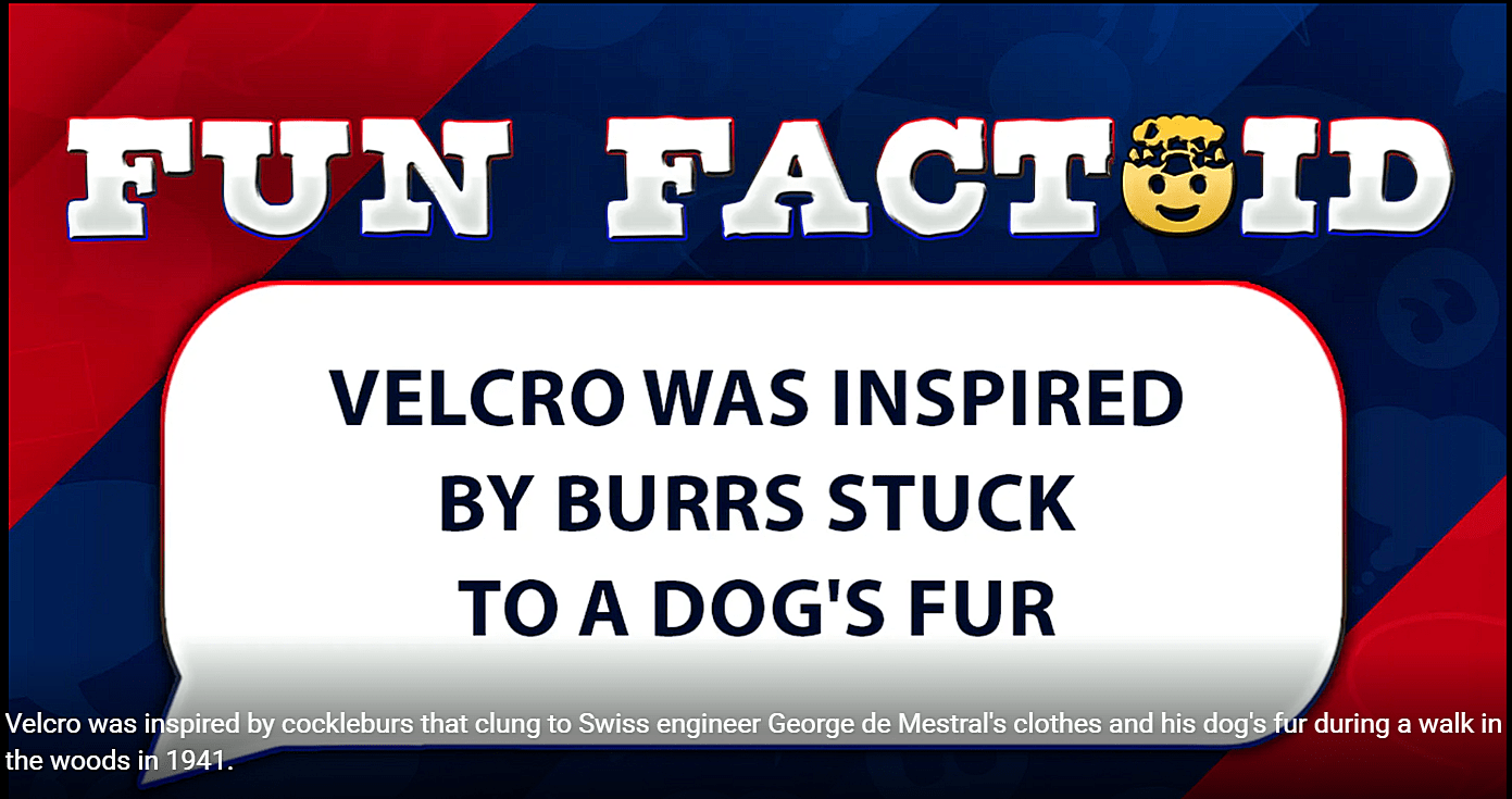 Bottom image text reads: Velcro was inspired by cockleburs that clung to Swiss engineer George de Mestral’s clothes and his dog’s fur during a walk in the woods in 1941.