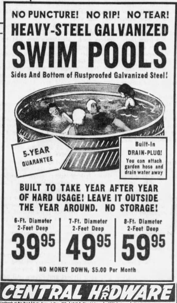 But by whatever name, they were all over the place by the end of that decade. My mom’s family had a stock tank pool by the mid-1960s - the same one, in fact, that we inherited 20 years later. And so many kids swimming in a piece of industrial equipment that wasn’t intended for swimming made for a shared experience, sometimes a painful one.