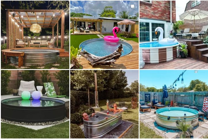 By 2020, stock tank pools had become a fixture in mainstream media trend stories from the New York Times to Domino to Apartment Therapy. Stock tank pool influencers declared themselves as “leading the modern stock tank pool movement”, DIY videos racked up seven-figure views, and of course there’s a healthy Reddit community. The builds have gotten more and more elaborate, with decks, pumps, filters, heaters, liners, and all manner of ways to make them more like regular pools.