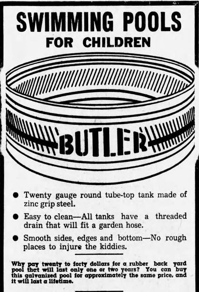 The trend caught on with at least some of the farm-supply industry, too. Here’s a 1954 ad from a Taylorville, Illinois dealer repurposing Butler stock tanks as swimming pools.