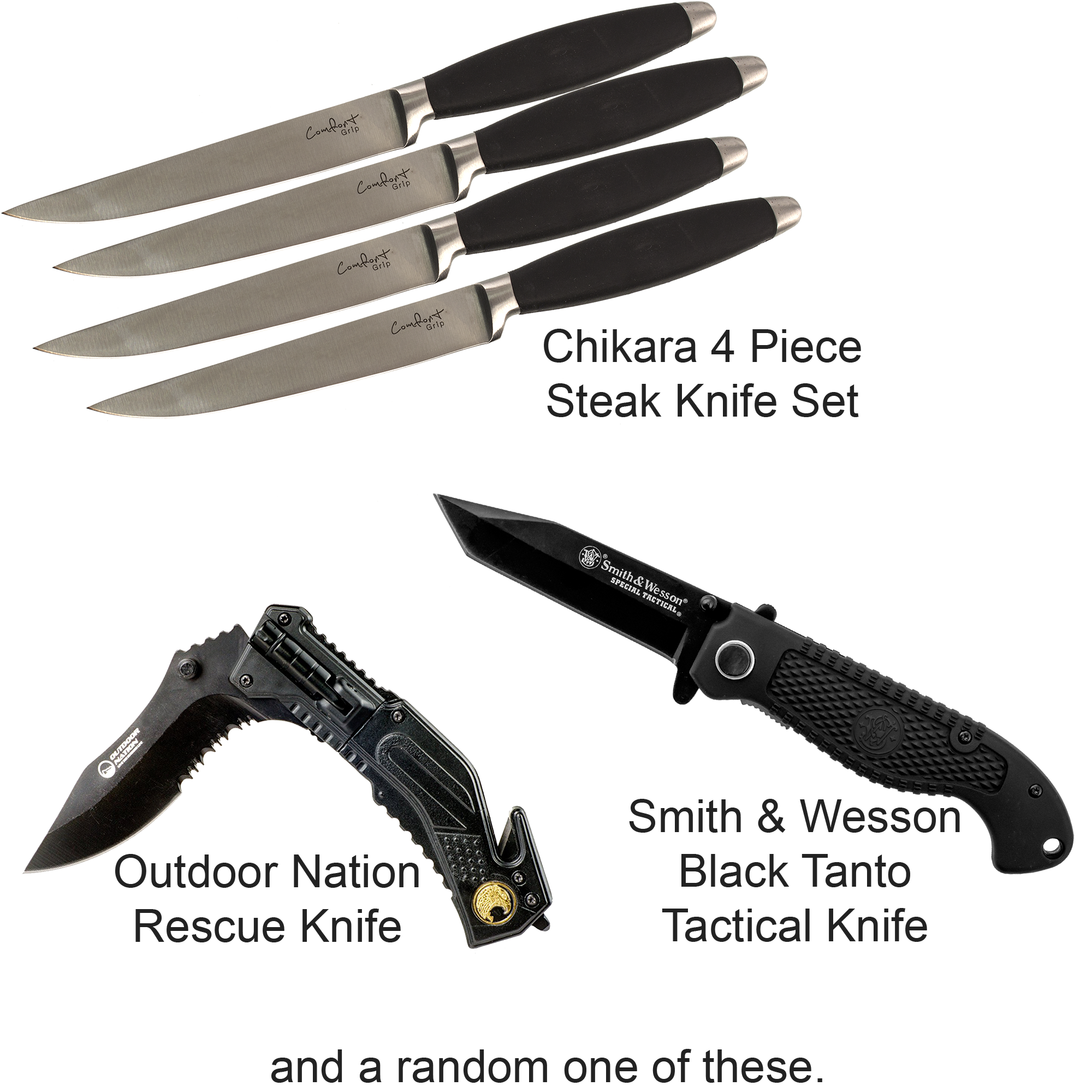 Gah, I want that S&W because I’m a sucker for tanto blades. I don’t know why, but I am. The rescue knife might be nice to throw in the glove box. I don’t really need steak knives, but, you know, knives. The other crap I have no need or use for. If I could pick my knife, I’d probably be in for a couple, but I don’t want to end up with like 3 bundles with steak knives. If there were a knife bundle, I’d be all over that. Can we do that?