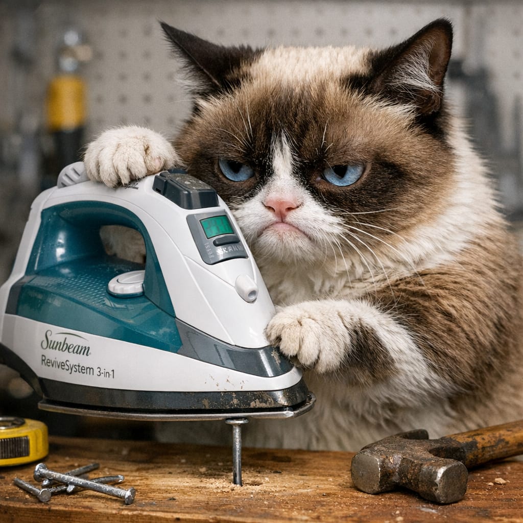 @cfg83 Here’s the image you requested for “Grumpy Cat forgot his hammer, so he is using Sunbeam ReviveSystem 3-in-1 Steamer Iron instead.”