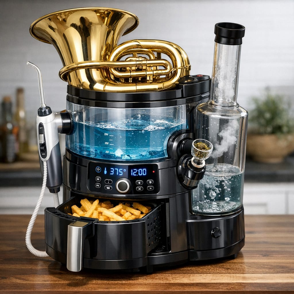 @zippyus Here’s the image you requested for “combination tuba, water flosser, air fryer, and bong”