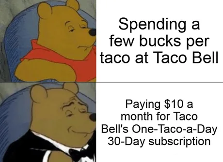 @Kyeh@sammydog01 They’re betting that one of two things will happen. Either people will pay the 10 bucks and not get 10 bucks worth of tacos, or people will subscribe and buy more food and/or drinks when they get the tacos.