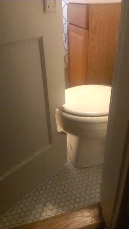 @mike808 @therealjrn And you put on a new door that has panels in it. Looks like you will just have to put the old door back on, scrape the tiles off the floor and then refinish the wood floor. (snicker). Should have made the slot bigger so that cats can get in and out.