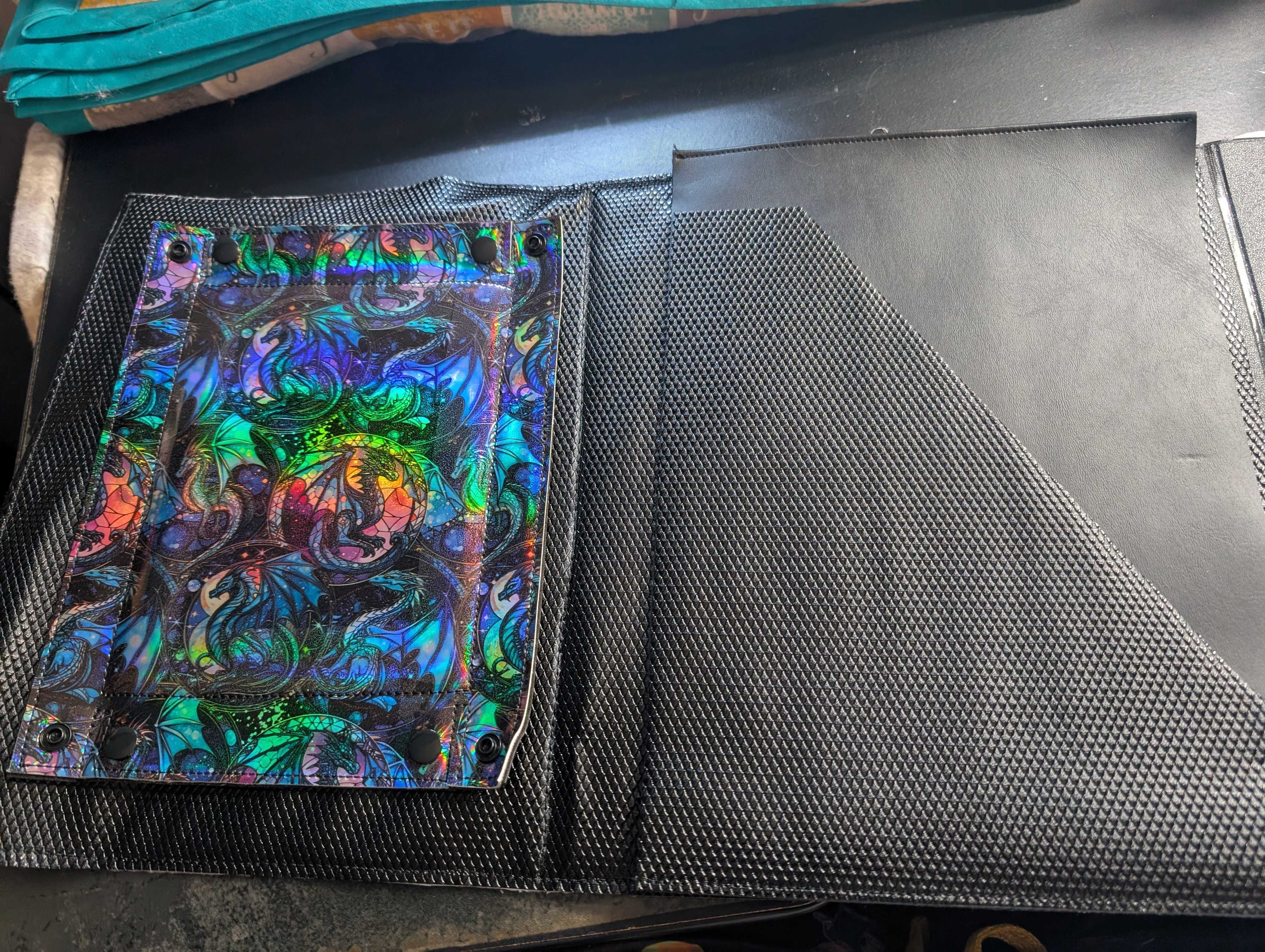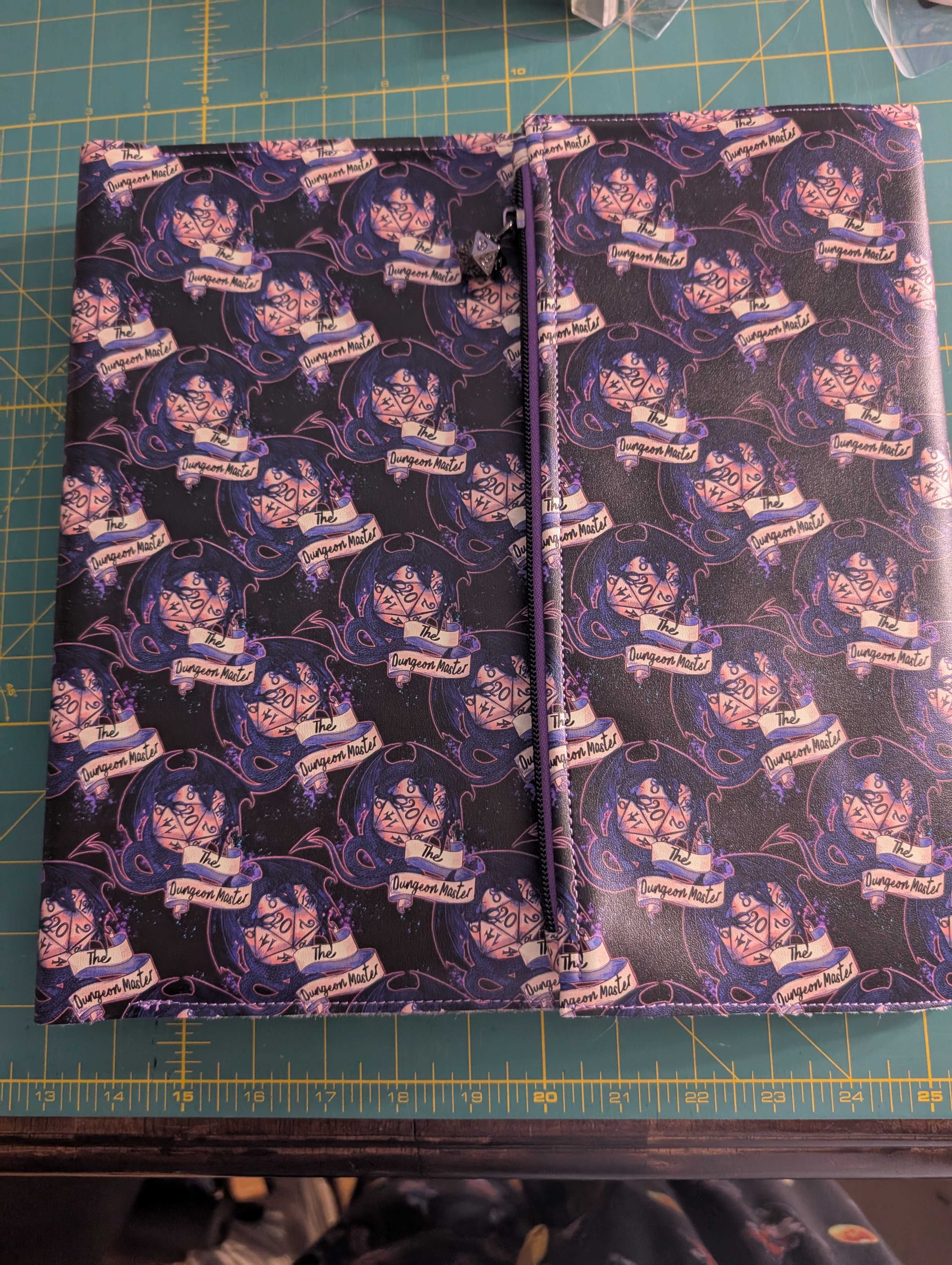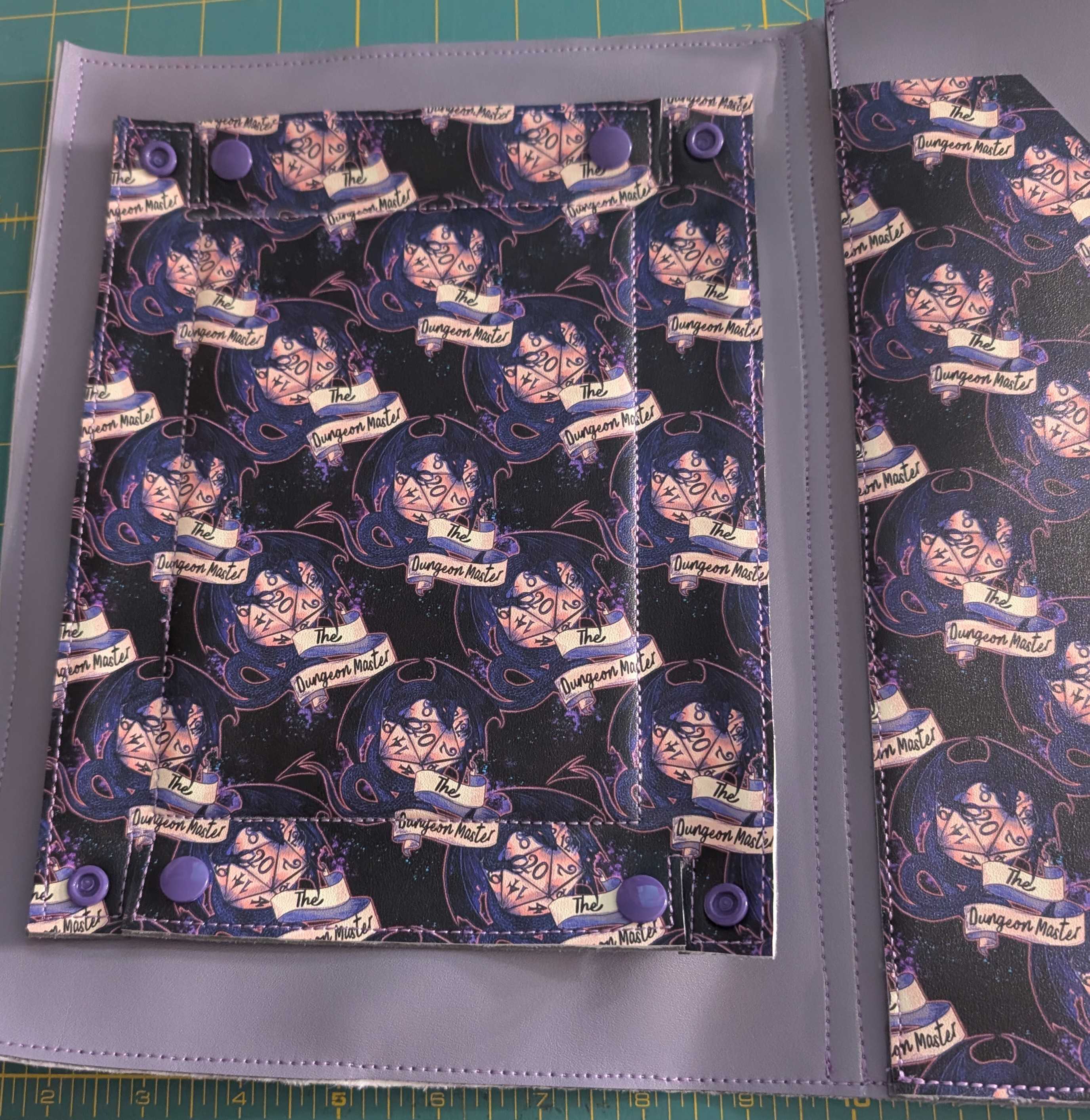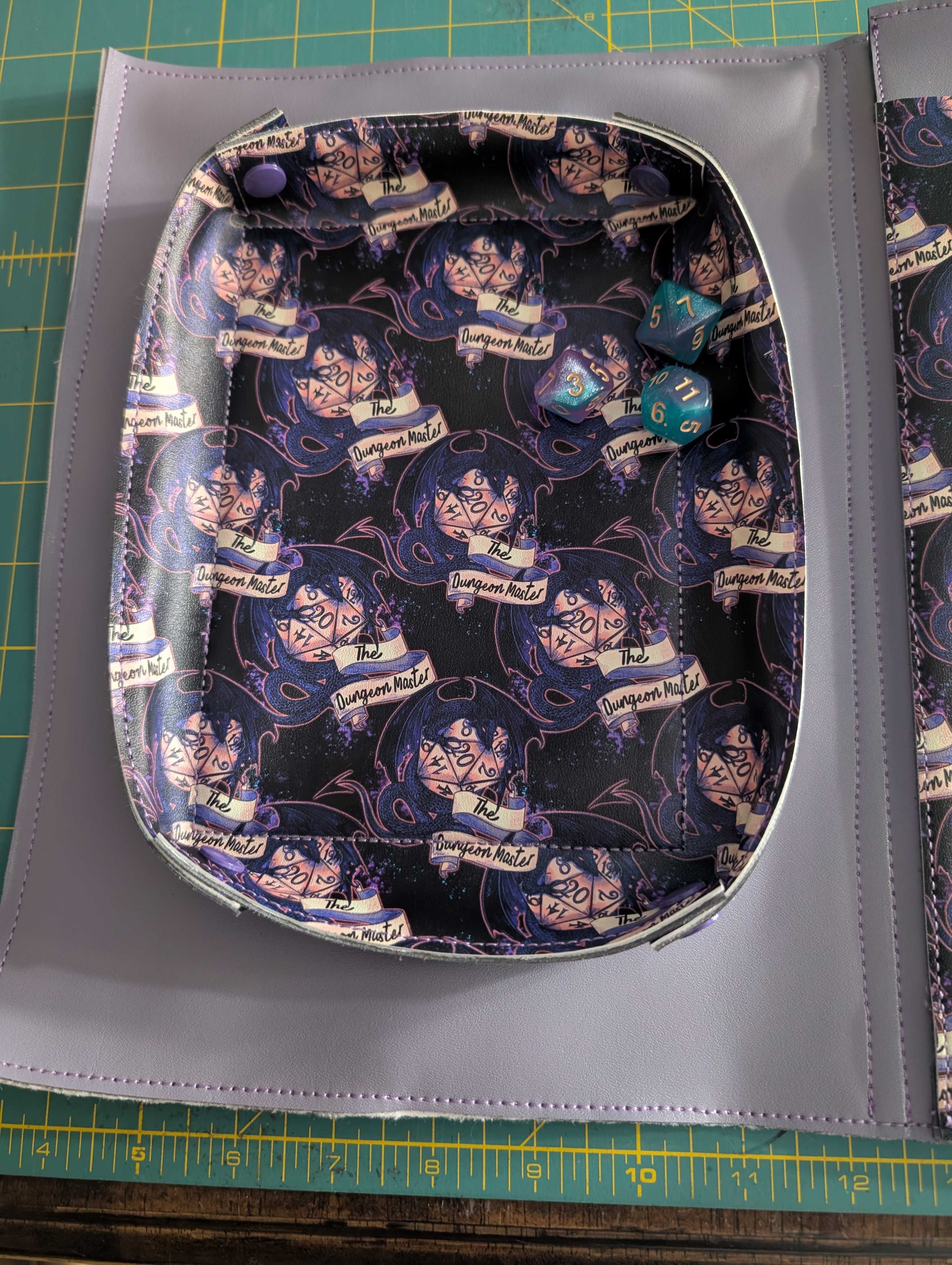 I made a couple of DND trapper keepers with a dice tray. I can’t take credit for the main trapper keeper style pattern, but adding the dice tray panel and making the middle portion a stats sheet holder was my adjustment.
