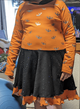 Maybe add a flair to the purple one? Something like the top photo with the layers but show more of the purple and fans out when she spins. Or a wide lacy with a fun bow thing. I would say a cute sweater but you can’t cover those sleeves.