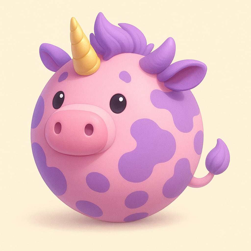 A spherical (no legs or neck) pink and purple cow with a unicorn horn, lavender-color mohawk, ears, and tail.