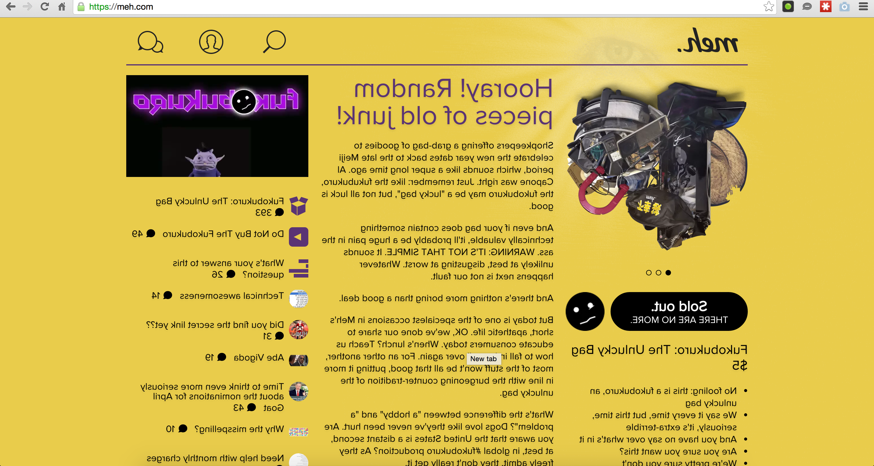 But today is one of the specialest occasions in Meh's short, apathetic life. It's a battlefield. It's a dystopia. It's hostile territory. OK, we've done our share to educate consumers today. When's lunch? For an other another, most of the stuff won't be all that good, putting it more in line with the burgeoning counter-tradition of the unlucky bag.