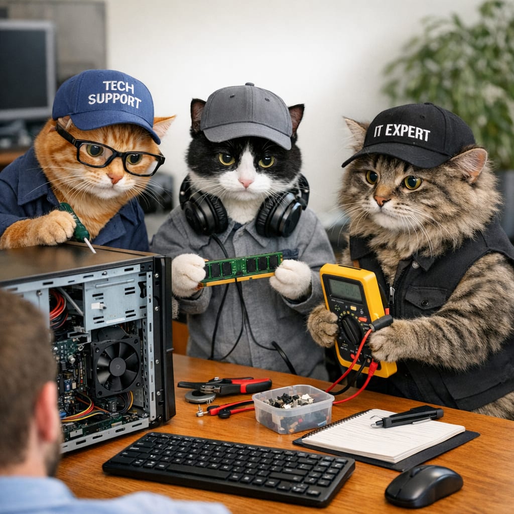 /showme Cats dressed up as Computer techs fixing computer at a clients desk