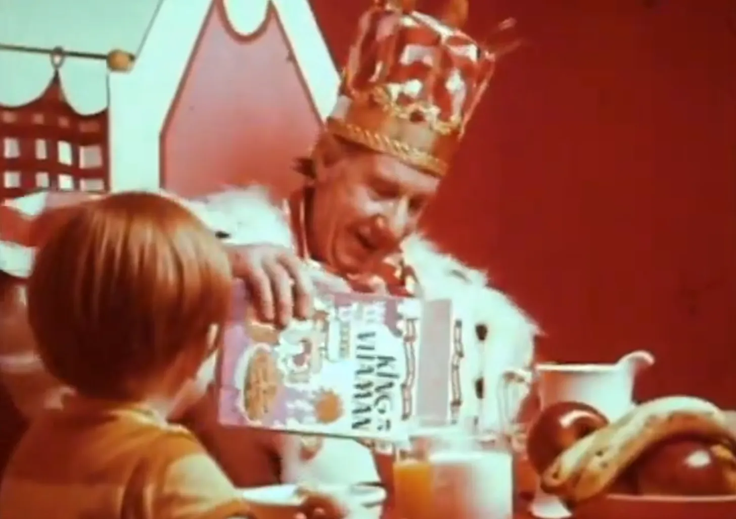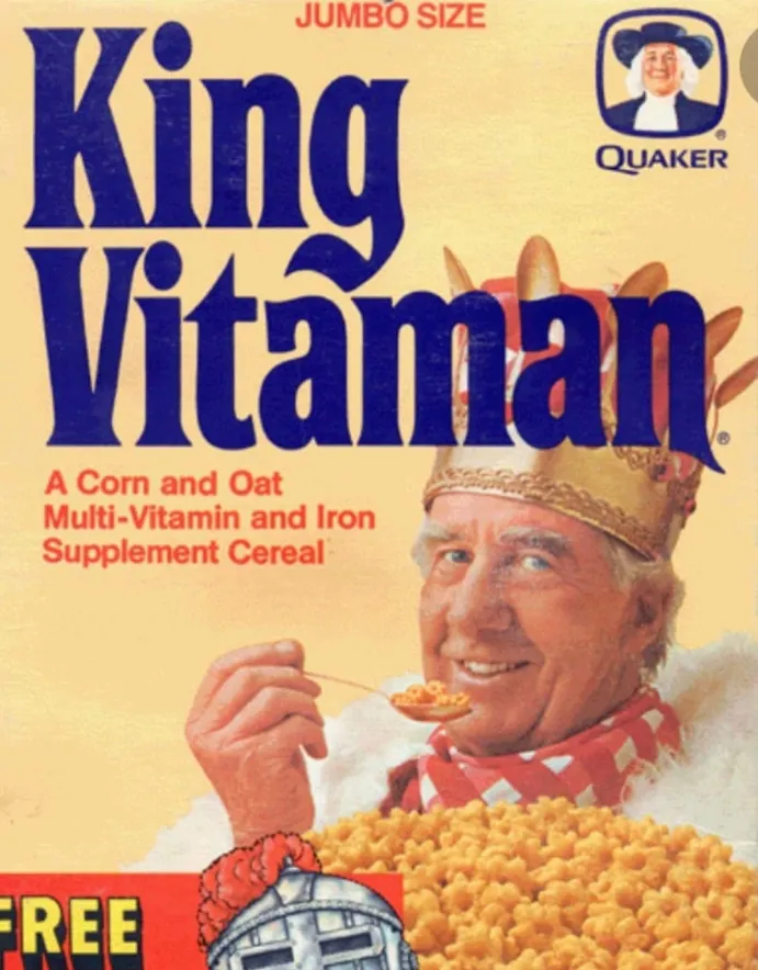 The most distinctive thing about King Vitaman was the box. Instead of a cartoon character, Quaker went with this human actor in a crown of spoons spray-painted gold, which always seemed a little chintzy even to my undiscriminating kid’s eye. Aside from his age, there was nothing especially regal about him; with his bushy eyebrows and unkempt hair, smiling over a poised spoonful of crunchy yellow chunks, he seemed more goofy than kingly, more friendly than imperious. (His original box was even goofier.)