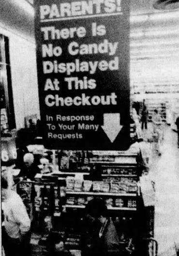 “We have heard from parents who said shopping would be so much more enjoyable if they did not have to face that candy temptation in the check-out aisles,” said Eileen Katz of Giant Food in 1986 about her company’s new unsweetened lane. “This is a small thing for us to do to make people happy and make shopping less annoying for parents.”