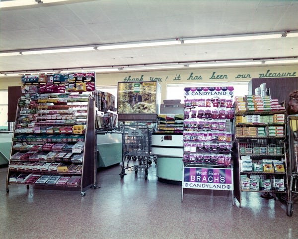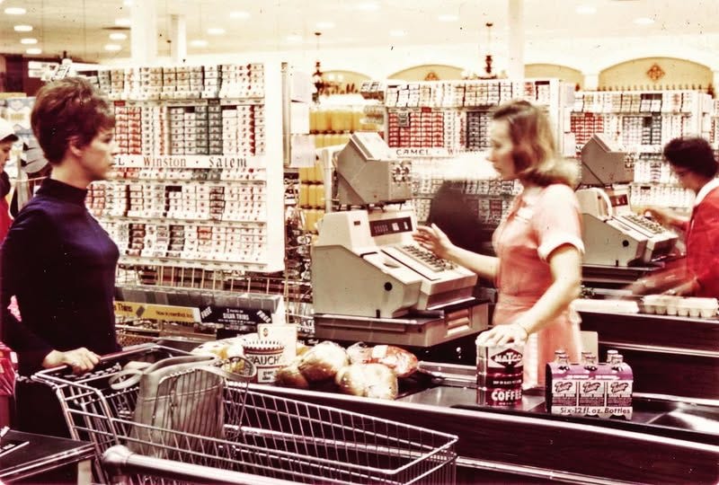 If you were going to pick a company to spread this gospel in 1962, you couldn’t do better than Wrigley. Once the gum behemoth got the “new impulse buying centers” ball rolling, the idea soon took over food retailers of all sizes, from supermarkets to corner stores. It’s hard to find a photo of a grocery checkout after the middle of that decade without a rack of the kind of small, cheap indulgences Stern described: gum, candy, magazines, and of course, cigarettes.