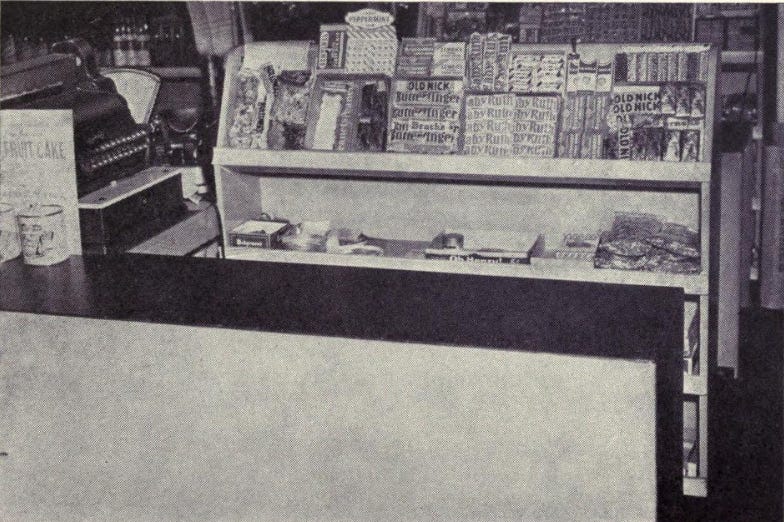 Other photos from the era are just as likely to show eggs or bread displayed at the counter as gum or cigarettes. Most commonly, there’s nothing on display at all. It would take some strategic and commercial muscle to make the checkout impulse rack a universal fixture.