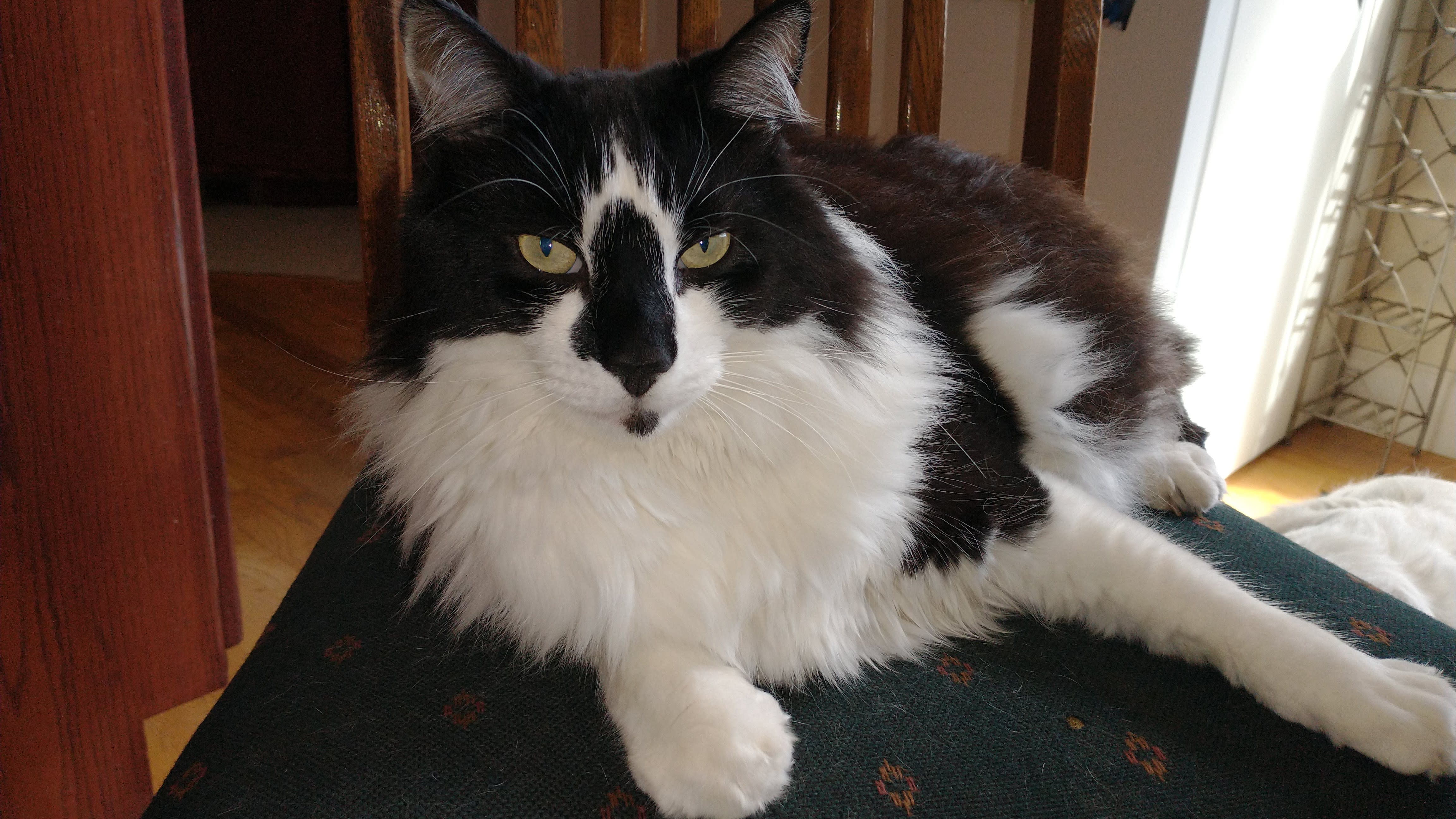 Charlie - came from our vet’s office. He wasn’t properly socialized as a kitten and caused all sorts of problems with one of the tech’s cats (she’d adopted him). She asked if we’d take him. We did. Pretty cat, black and white and I wish he’d quit opening the cabinet doors in the kitchen and sleeping on our cookware (a crockpot in the very back corner is a fave).