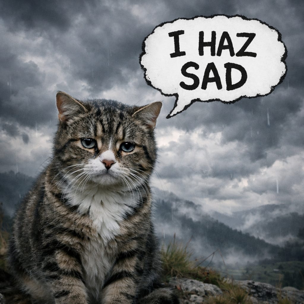 @phendrick Here’s the image you requested for “cat in very cloudy outdoors setting, saying I HAZ SAD”