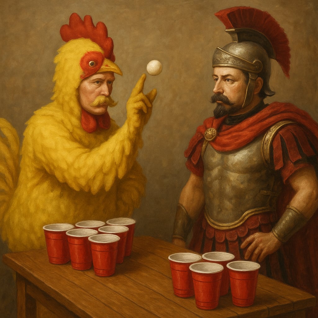 /showme general custard in a chicken costume playing beer pong with Napoleon the third wearing a roman centurion costume.