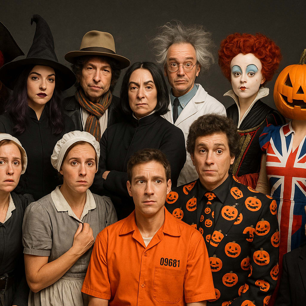 /showme Pirate, red-haired woman in steampunk renaissance garb, cool witch with purple hair, Bob Dylan dressed in bohemian style including a fedora and a striped scarf, woman dressed as professor snape, overheated, sweaty Puritan maid, a mad scientist, middle-aged white man in a black perm wearing a suit that’s covered in jackolanterns and a jackolantern tie with a black shirt, a lady wearing a British flag dress who has a jack-o’-lantern for a head and a striking red wig, the red queen, nervous man in an orange prison jumpsuit, and a cat dressed as a human joining the Halloween party.