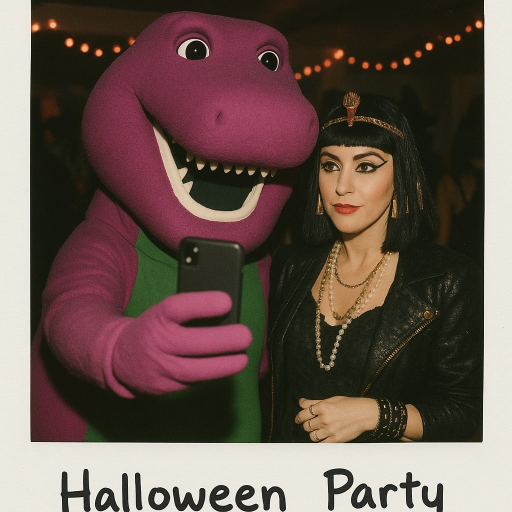 /showme a Polaroid photo of Barney the dinosaur dressed up as a T. rex taking a selfie with Cleopatra dressed like Madonna in “Desperately Seeking Susan” at a halloween party