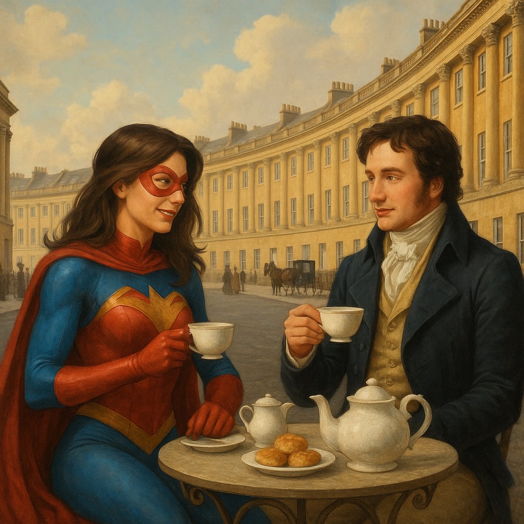 /showme female superhero in red and blue costume having tea with Mr Darcy in Regency era city of Bath in England