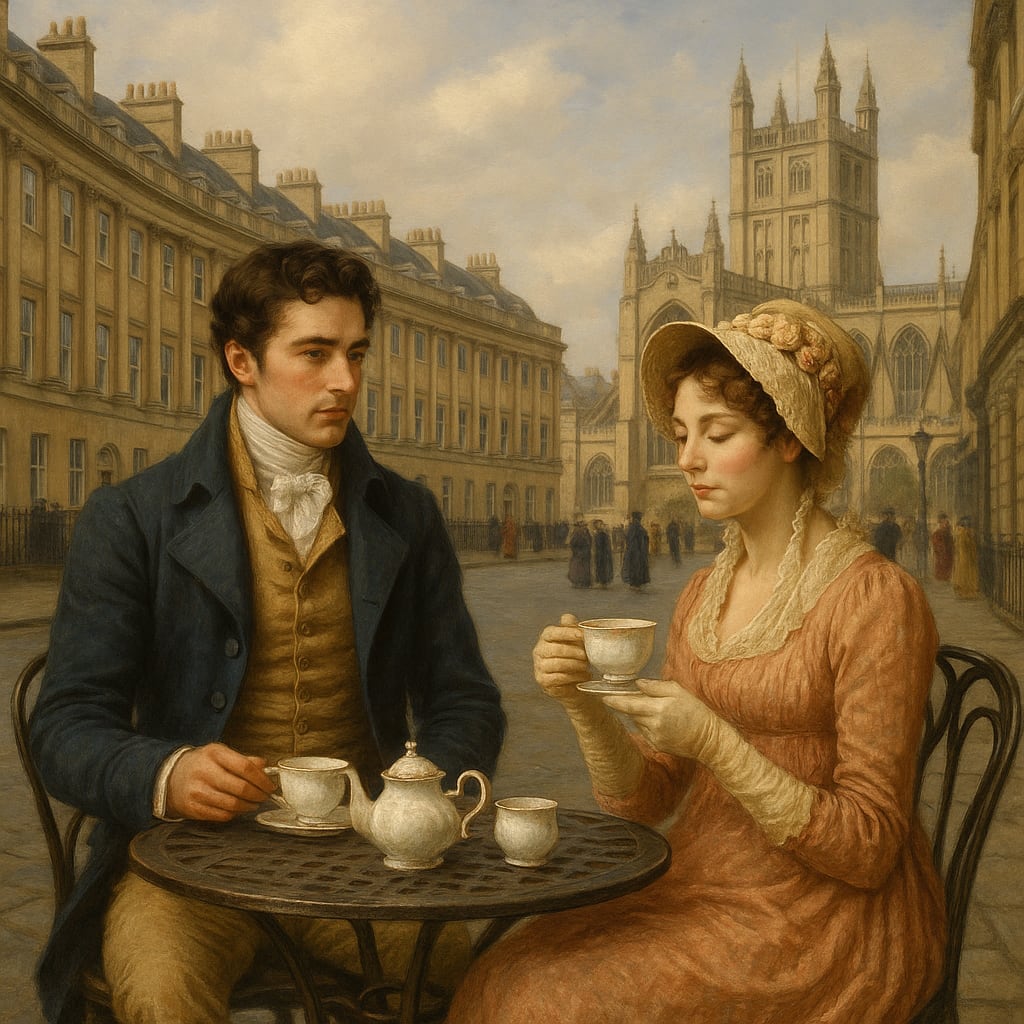/showme wonder woman having tea with Mr Darcy in Regency era city of Bath in England