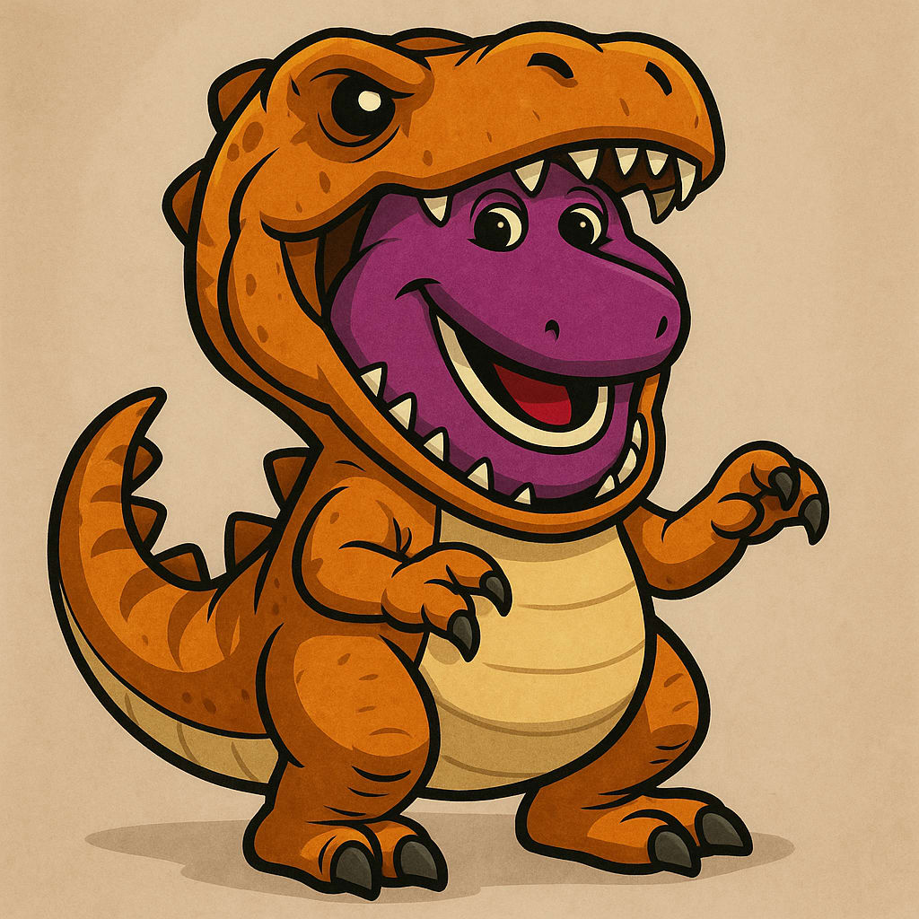 /showme Barney the dinosaur dressed up as a T. rex