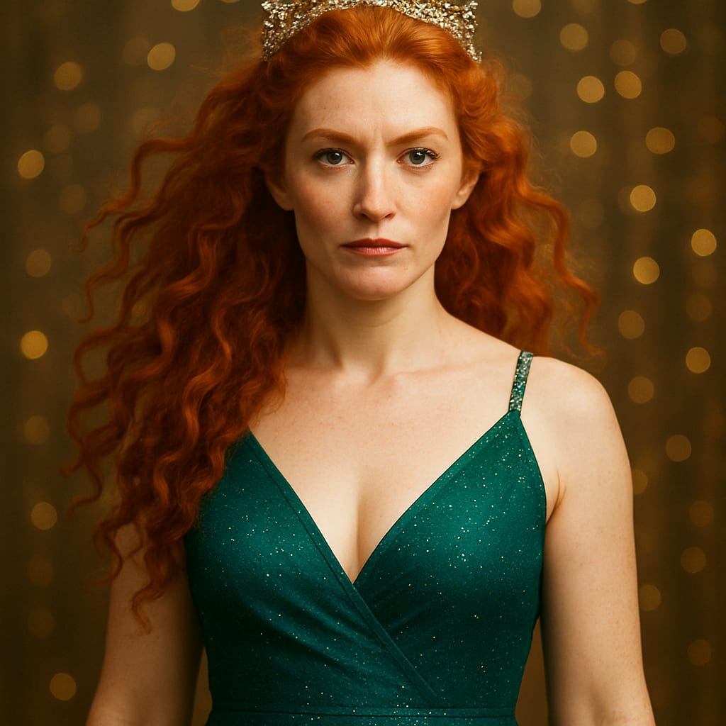 /showme Boudicca in a party dress, with a sparkle crown