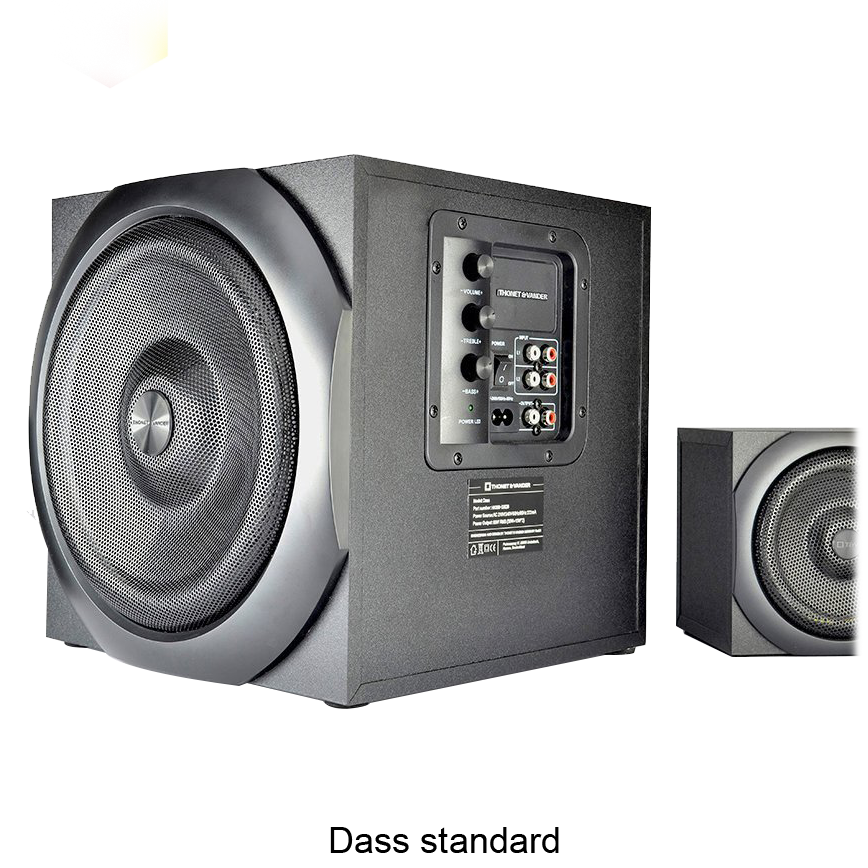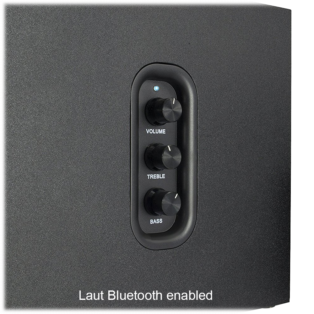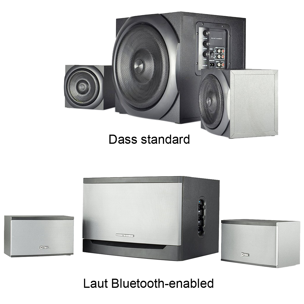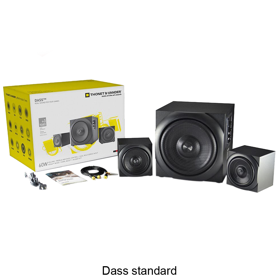 Specs ====Dass:- Model: Dass- Power output: 60W RMS (30W + 15W x 2)- Peak power: 300W- Frequency response: 50Hz - 20kHz- Distortion: <0.1% - 1W- S/N: >70dB- Separation: >50dB- Acoustic box material: Wooden HDAA- Acoustic box size: 250 x 150 x 230 mm- Driver size: 6.5"- Driver material: Cane Lignin- Impedance/Power: 8 35W- Satellite size: 125 x 125 x 105 mm- Mid-range size: 3.5"- Mid-range material: Cane Lignin- Impedance/power: 4 15W- Antimagnetic shield- Controls: Volume, treble, bass- Inputs: Dual RCA stereoLaut:- Model: Laut- Power output: 60W RMS (30W + 15W x 2)- Peak power: 340W- Frequency response: 40Hz - 20kHz- Distortion: <0.1% - 1W- S/N: >70dB- Separation: >50dB- Acoustic box material: Wooden HDAA- Acoustic box size: 205 x 300 x 246 mm- Driver size: 6.5"- Driver material: Cane Lignin- Impedance/Power: 8 35W- Satellite size: 100 x 160 x 100 mm- Mid-range size: 3"- Mid-range material: Cane Lignin- Impedance/power: 4 10W- Antimagnetic shield- Controls: Volume, treble, bass- Inputs: Dual RCA stereoWhat’s in the Box? ====1x DASS or LAUT 2.1 Speaker system1x Power cable1x RCA-to-3.5mm Stereo Plug1x ManualPictures====OptionenDas ist LautDieser geht zu elf (nicht wirklich)Das ist DassViele knpfeVerpackungPrice Comparison ====DASS: $79.99 at AmazonLaut: $99.99 at Amazon