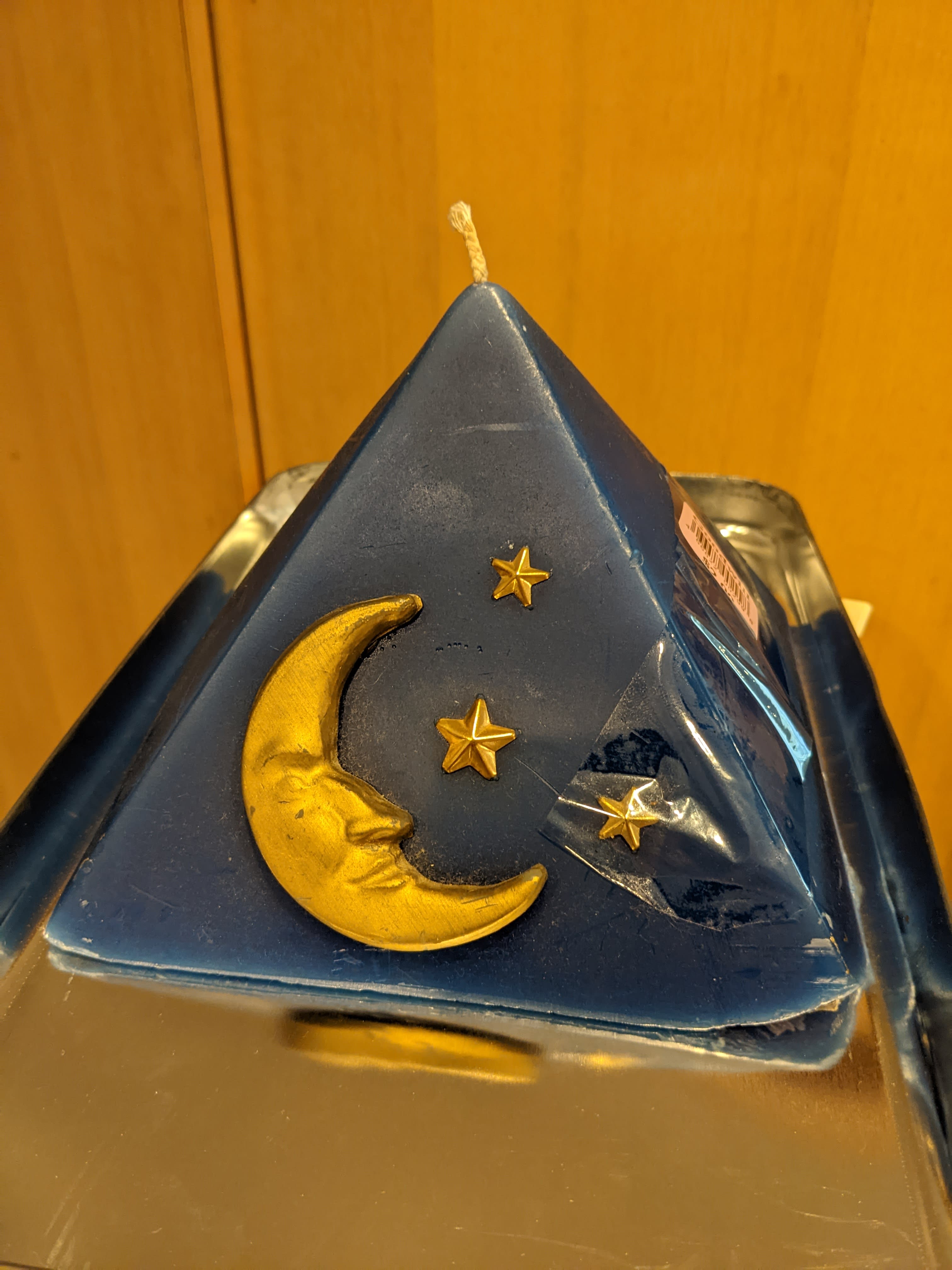 @Kyeh Treasure candle update: two charms: a tiny quartz (or glass) point and a tiny aventurine (or glass) crescent moon. Two more things I can feel under the melted wax when poking around with a butter knife. One metal and pointy (naked angel?), one flat (almost definitely a tumbled stone of some sort). Wax on my shirt? Yes. Will it come out? I don’t know.