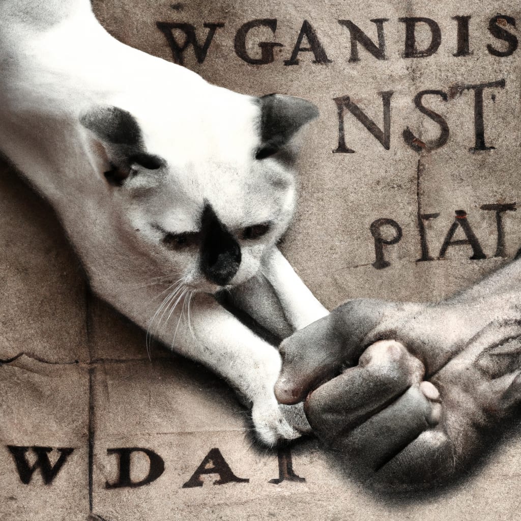 /showme a polydactyl cat with human hands commiting a crime against Gandhi.