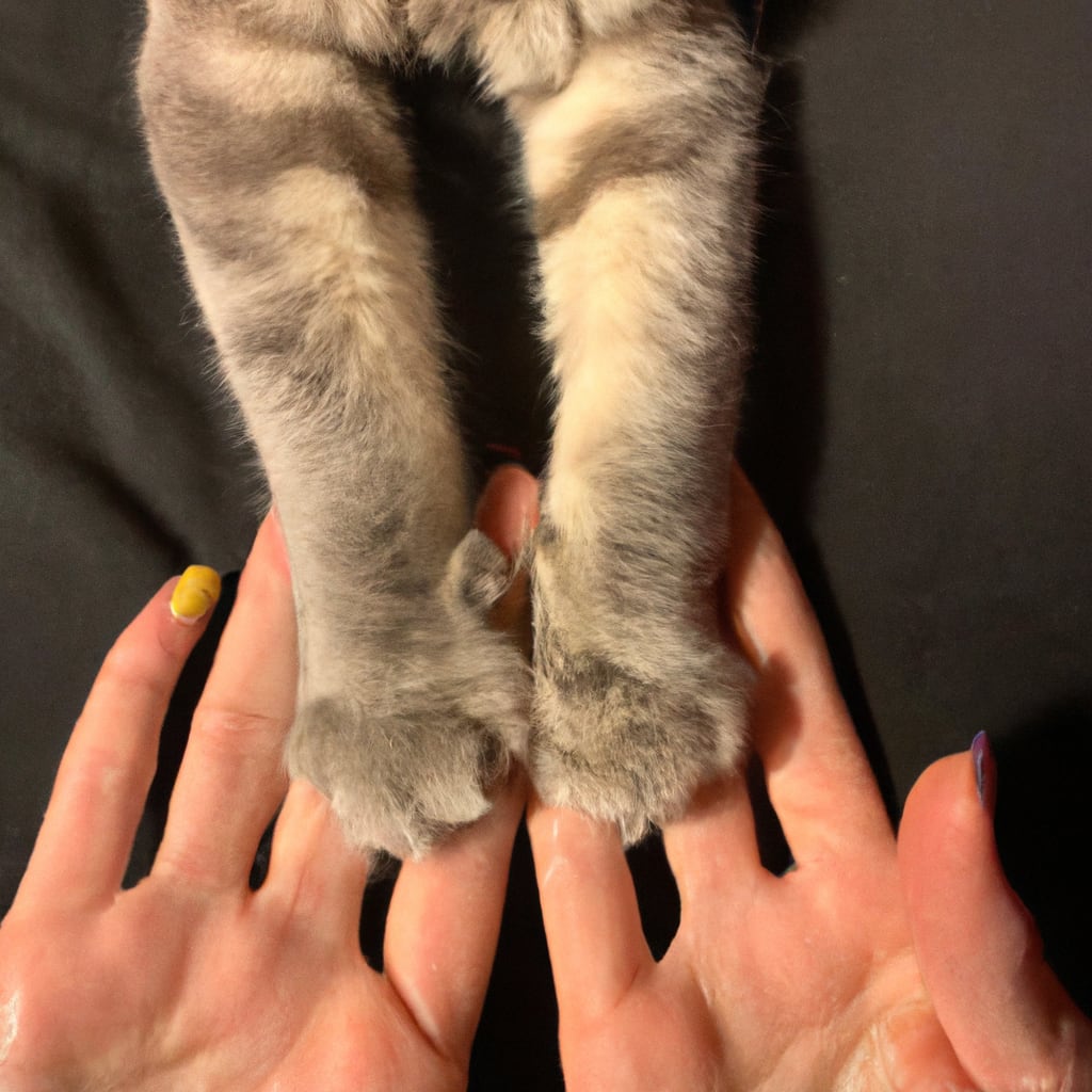 Cat paws resting on human hands is a reasonable misunderstanding. But the human hands are missing a finger, and at least one fingernail is on the wrong side.