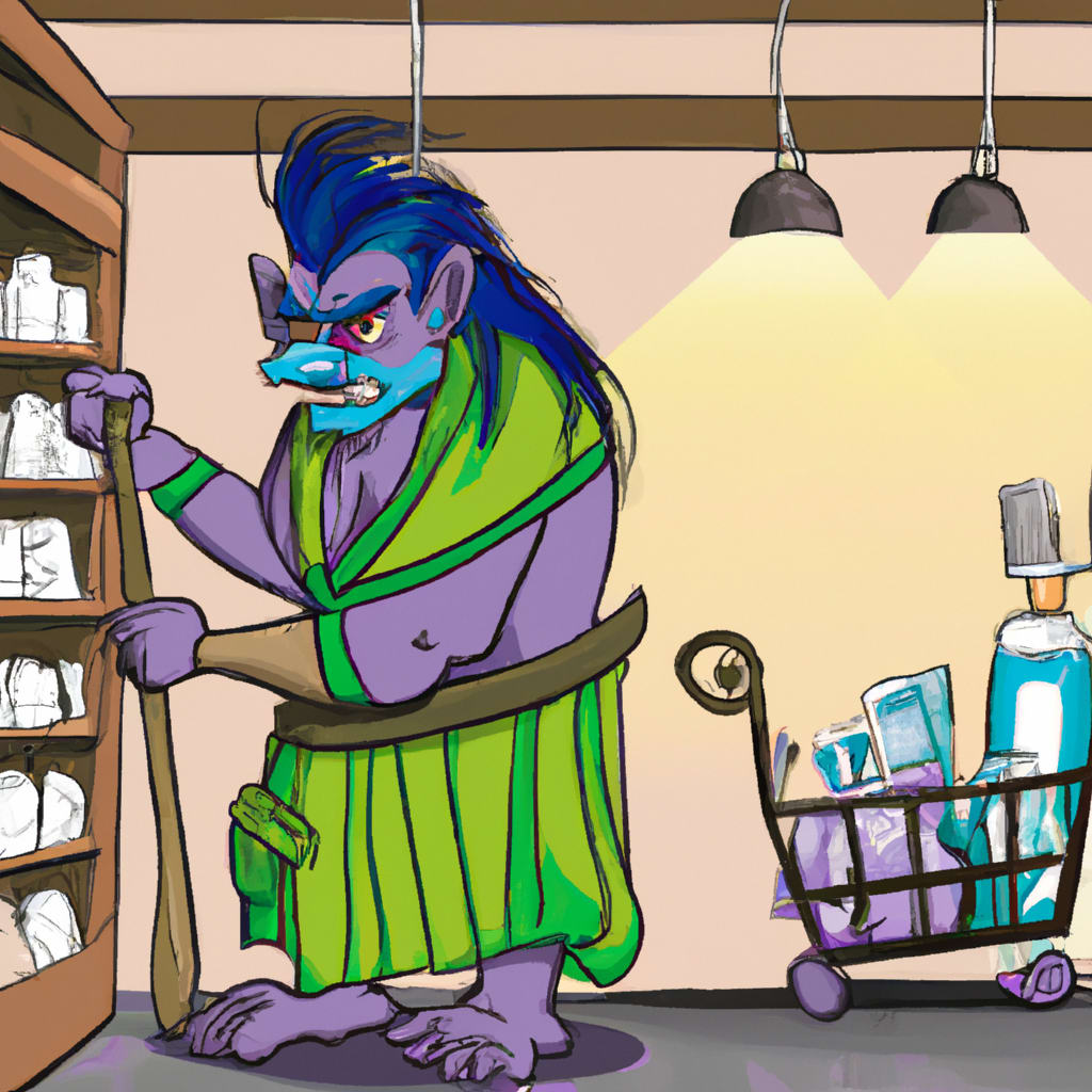 /showme a purple troll with a single tuft of black hair stealing toothbrushes from a warehouse.