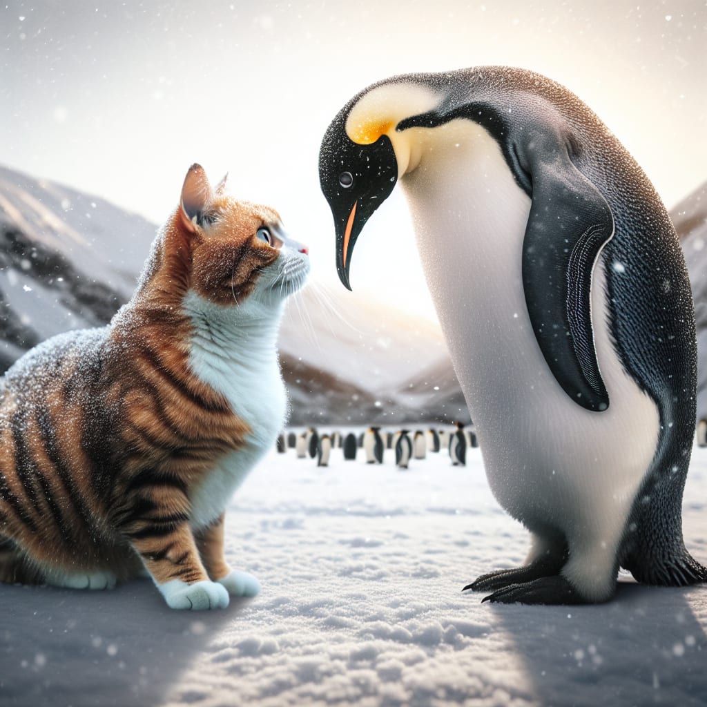 /showme a penguin sitting on a kitchen countertop unaware of a cat holding a chef’s knife behind it