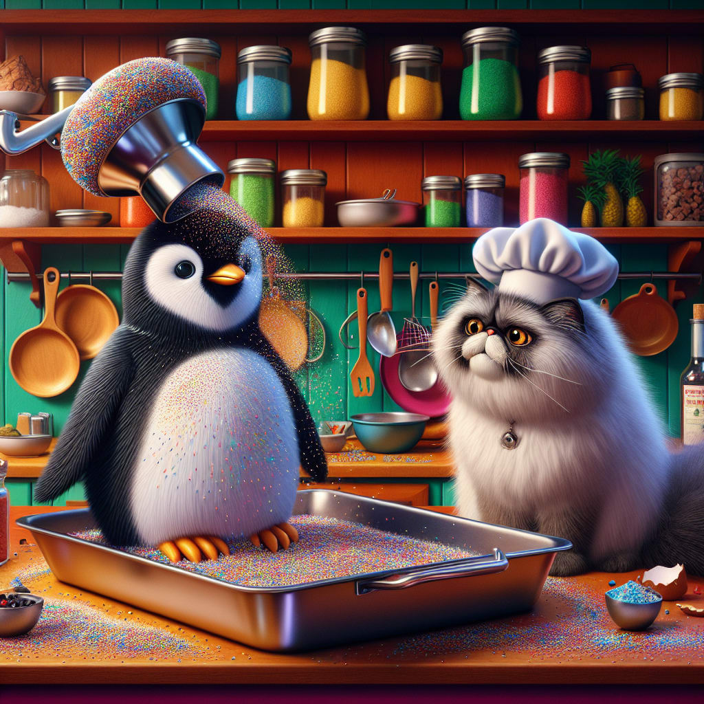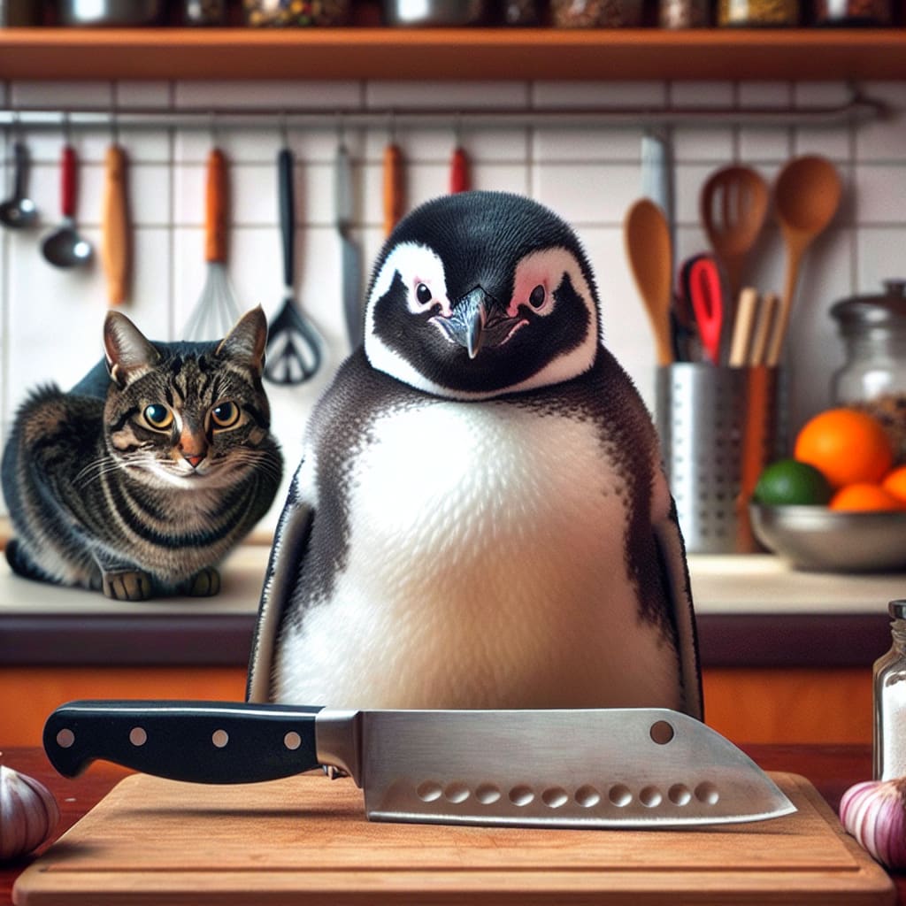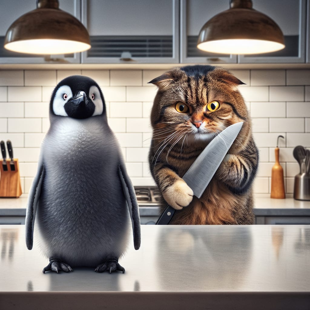 /showme a penguin sitting on a kitchen countertop unaware that a cat is holding a chef’s knife behind it