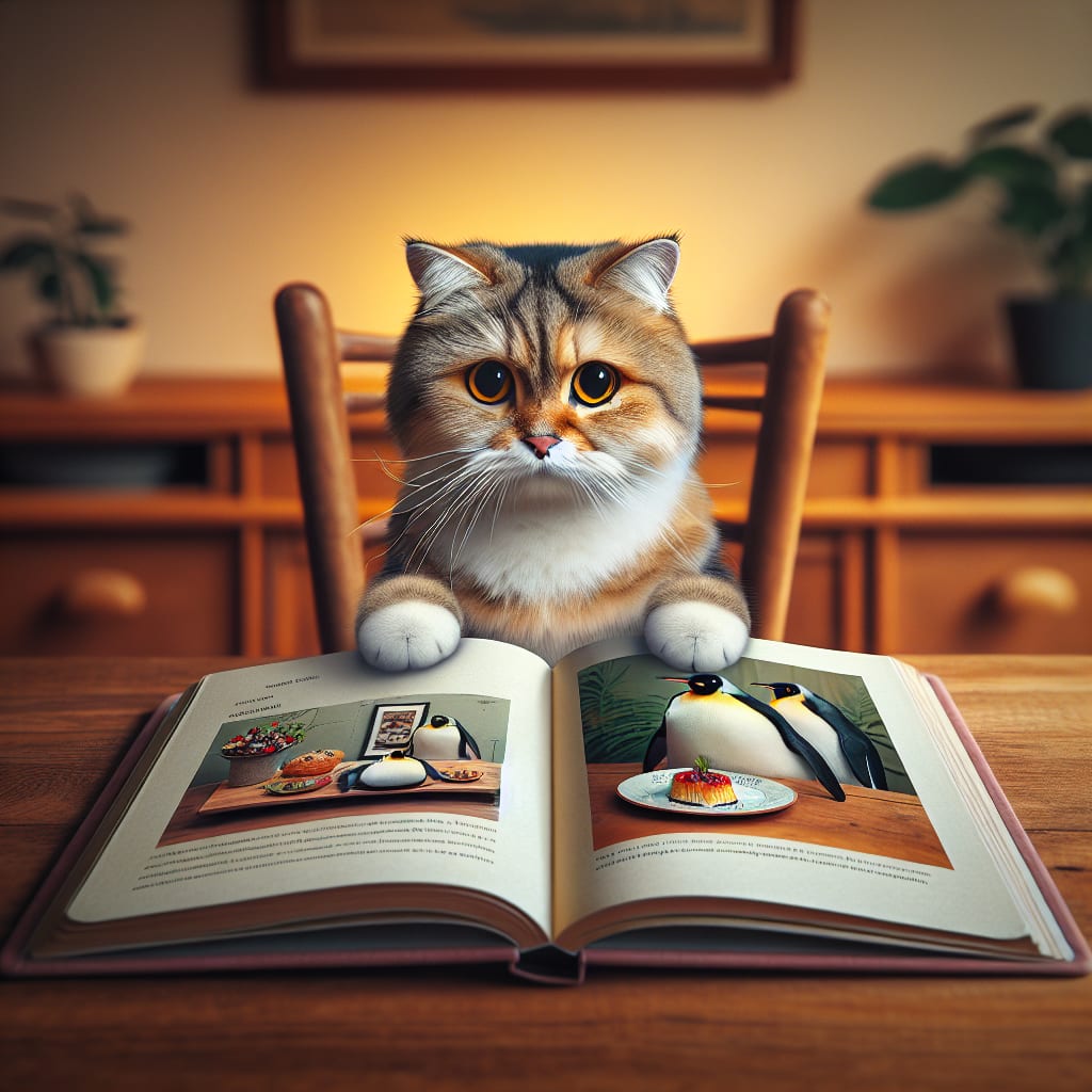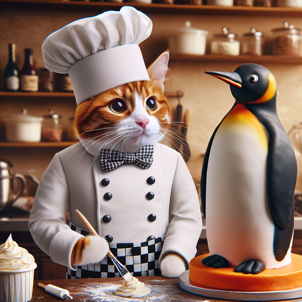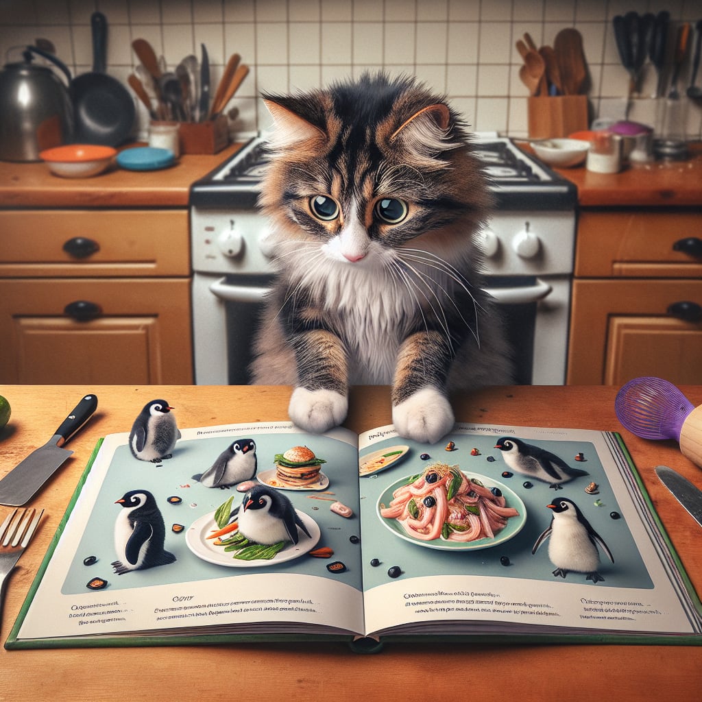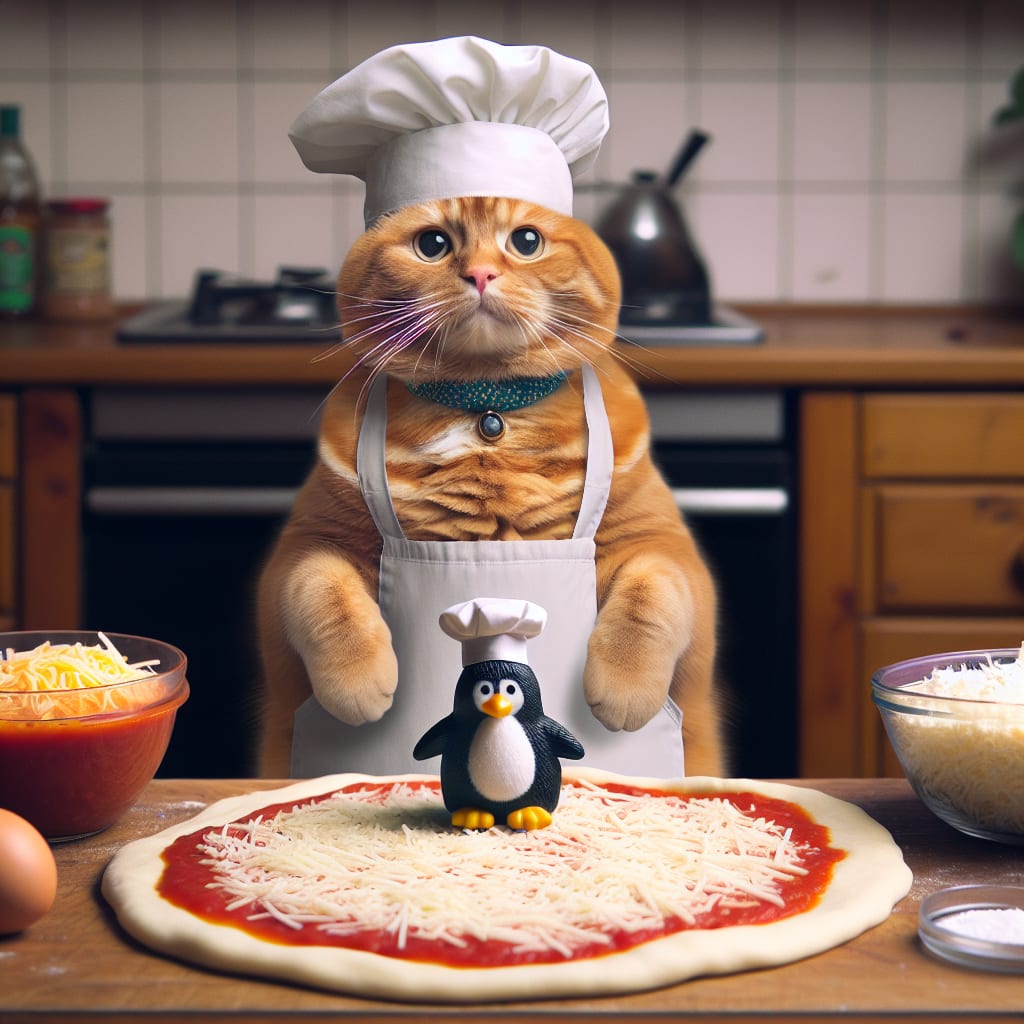 /showme a penguin sitting on a kitchen countertop unaware that a cat is holding a chef’s knife behind it