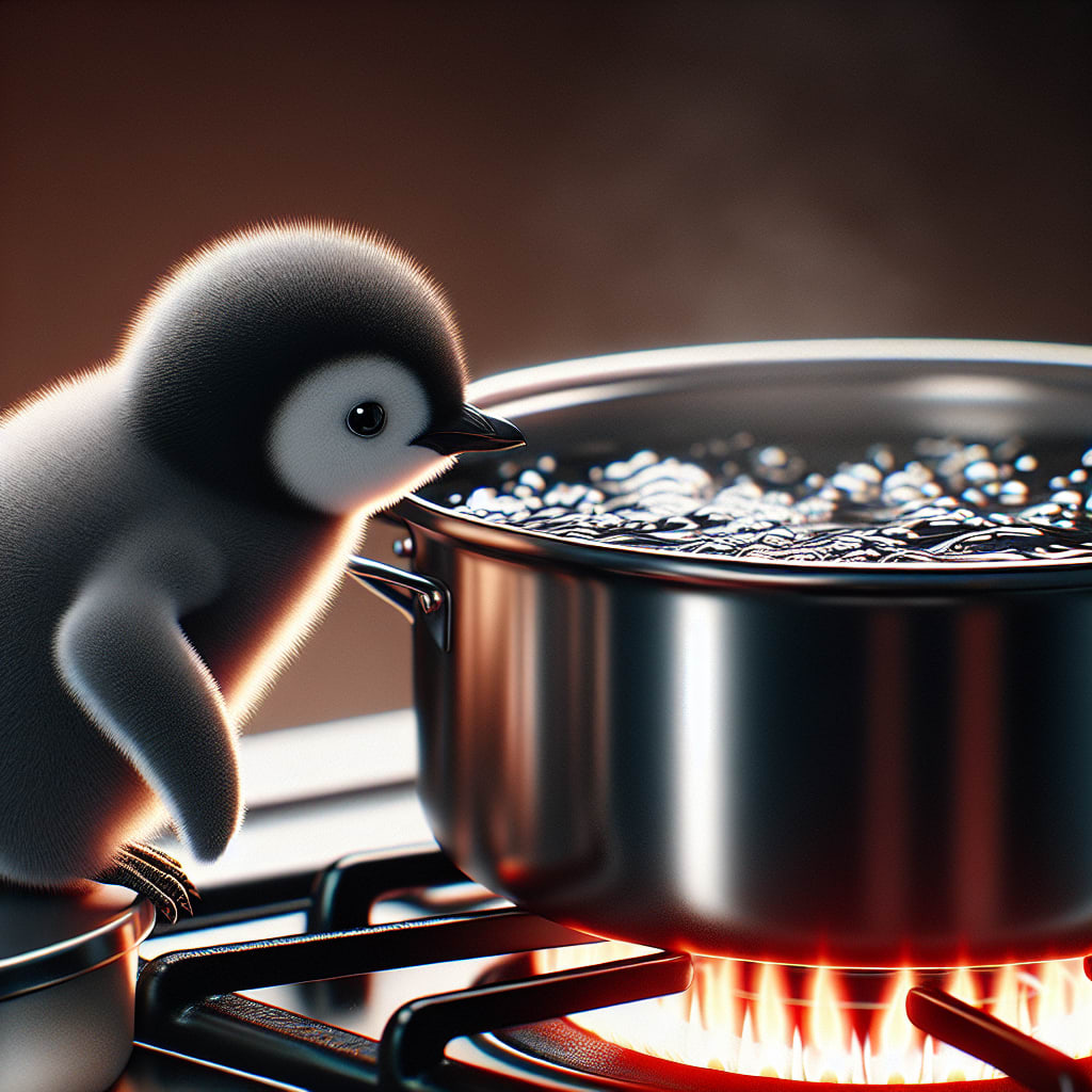 /showme a penguin about to dive into a pot of water that’s on top of a stove