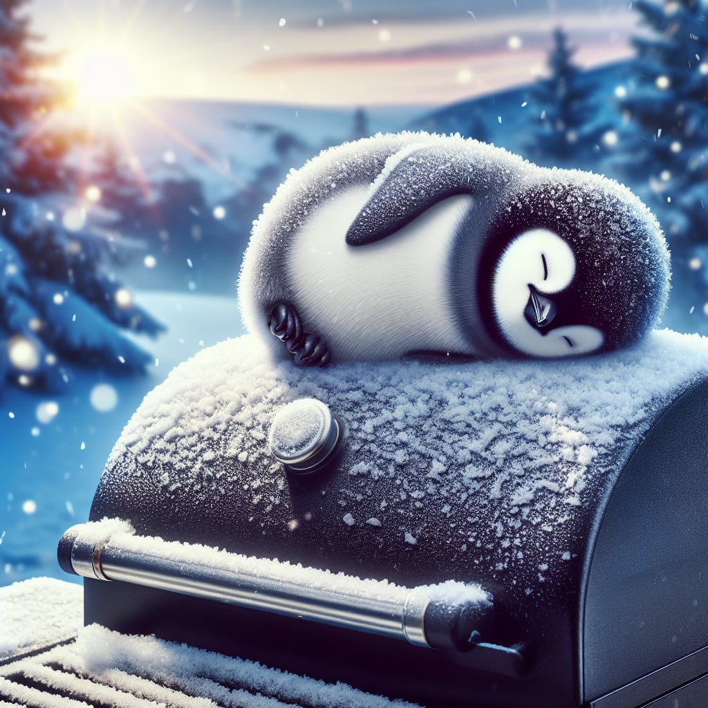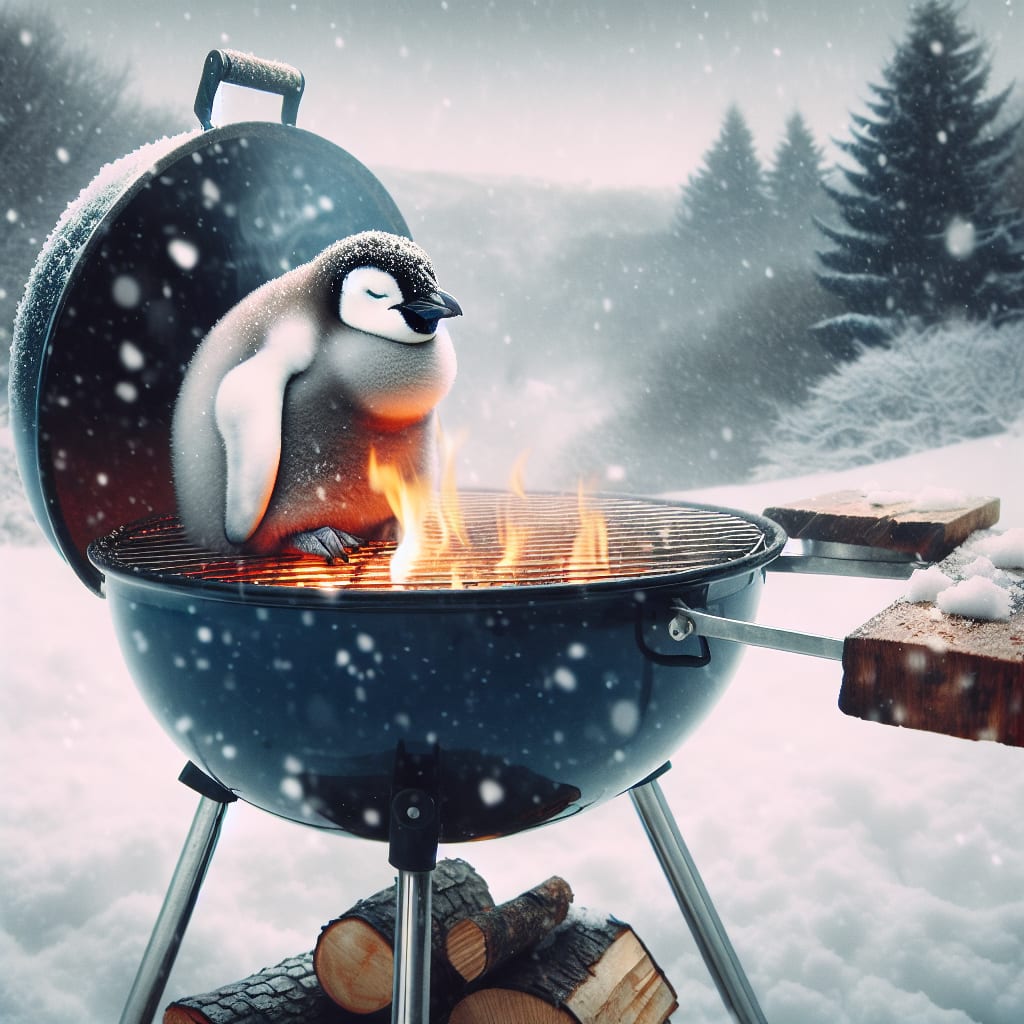 /showme a penguin sleeping on top of an open fire bbq because it’s cold and snowing