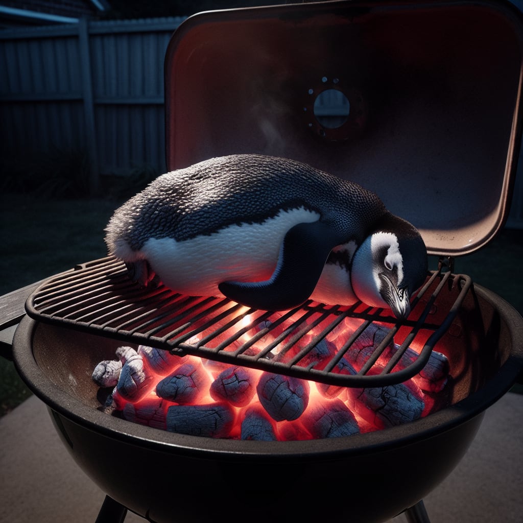 /showme a penguin sleeping on top of an open fire bbq because it’s cold