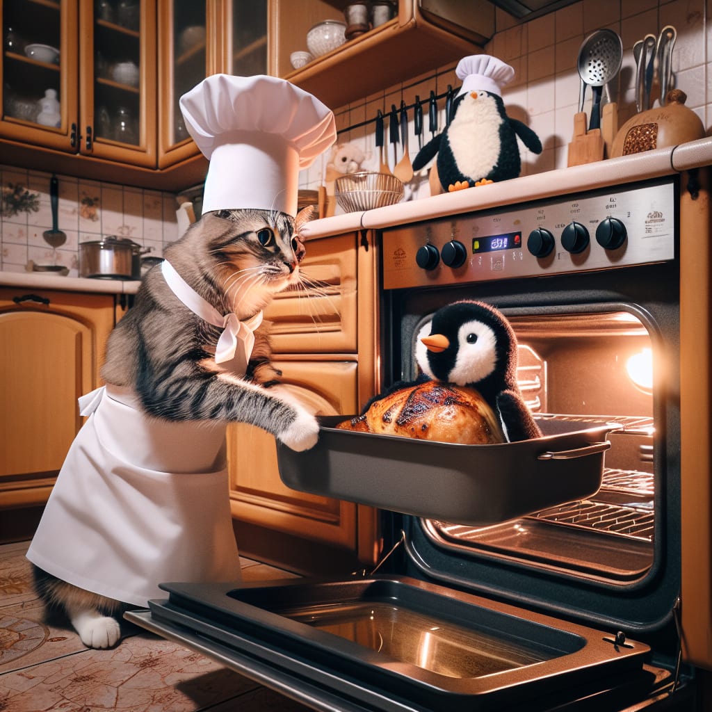 /showme a cat chef placing a roasting pan with a penguin in it into an oven