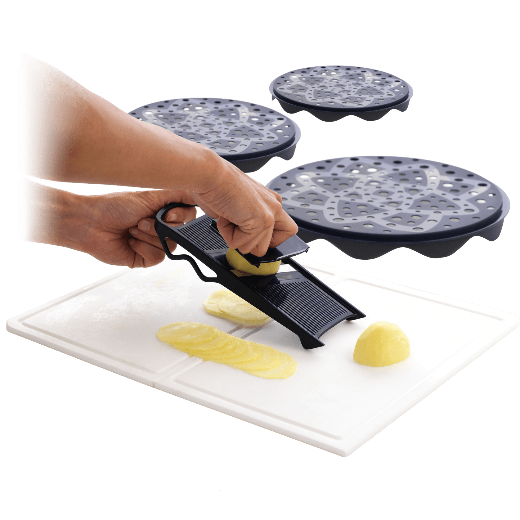 I got this set a few sales back. I use the mandolin daily for cucumbers on salad. I have made the chips a couple times but cheated and didn't use the trays.