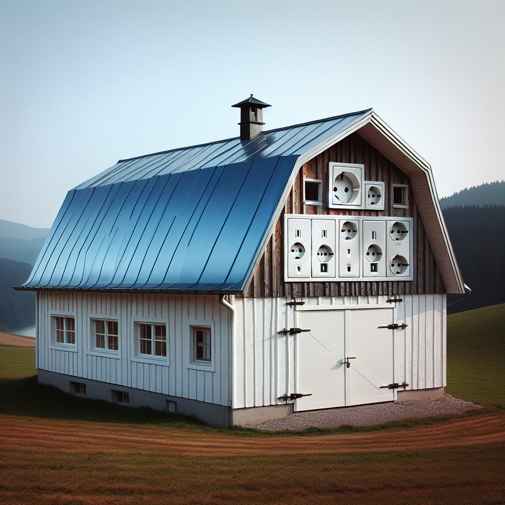 /showme a white barn with a blue roof that doubles as a plug adapter for various European countries.