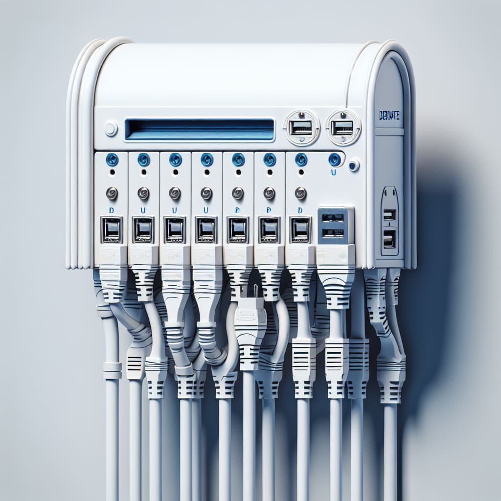 /showme a white mailbox with blue accents that has plugs coming out of it and USB ports
