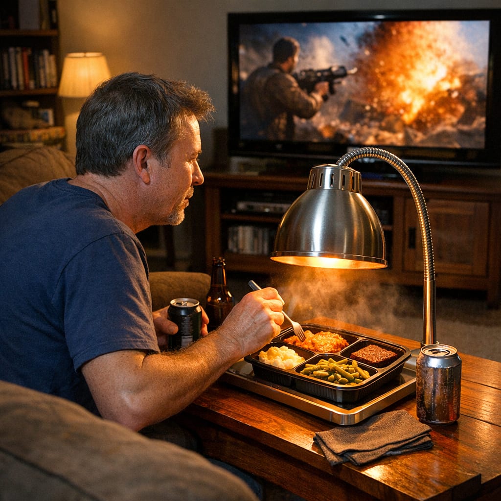@cfg83 Here’s the image you requested for “Person watching TV and eating TV dinner with hot lamp to keep the food warm.”